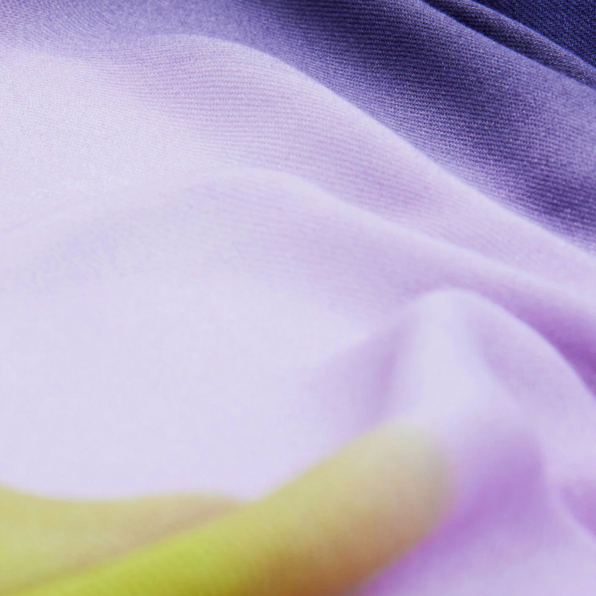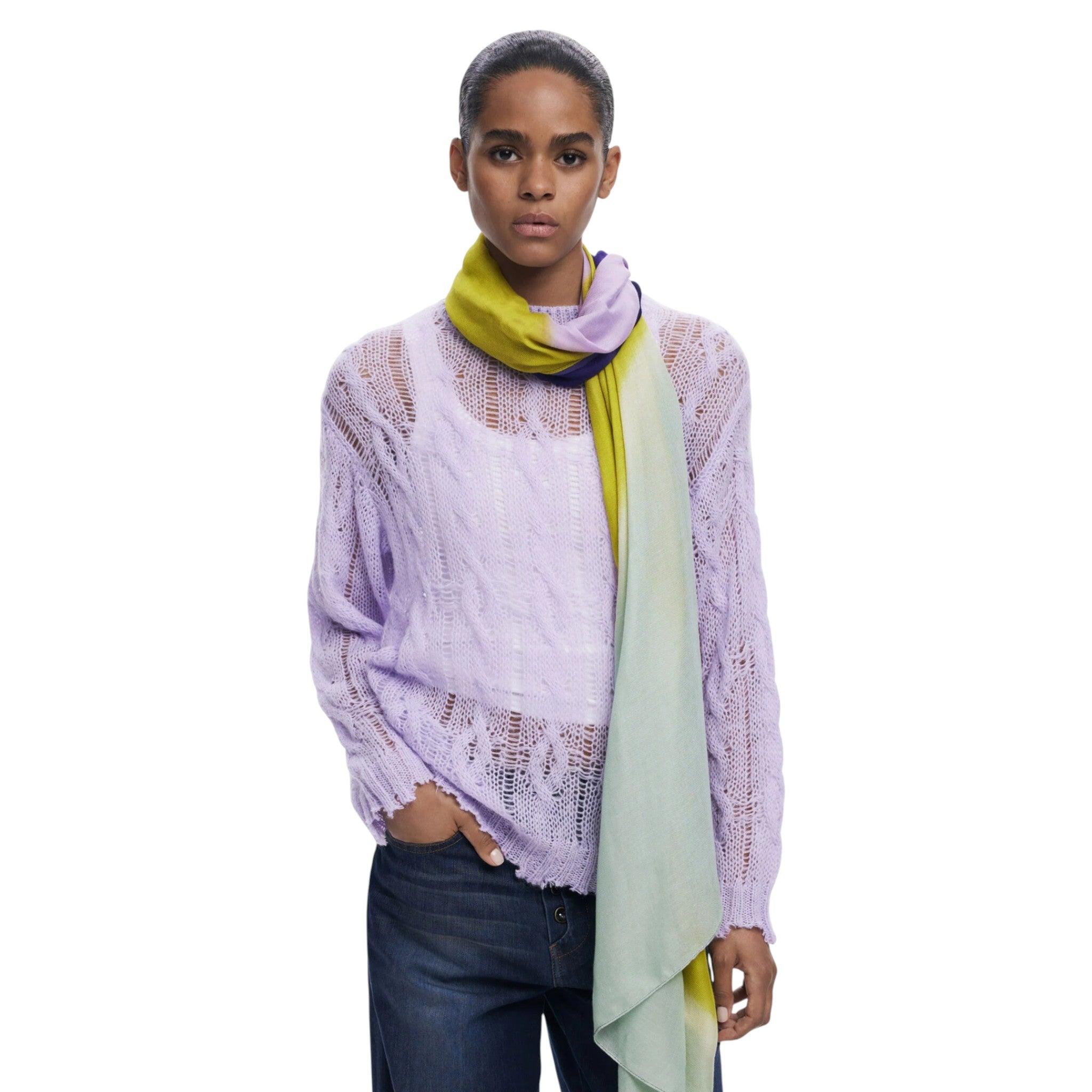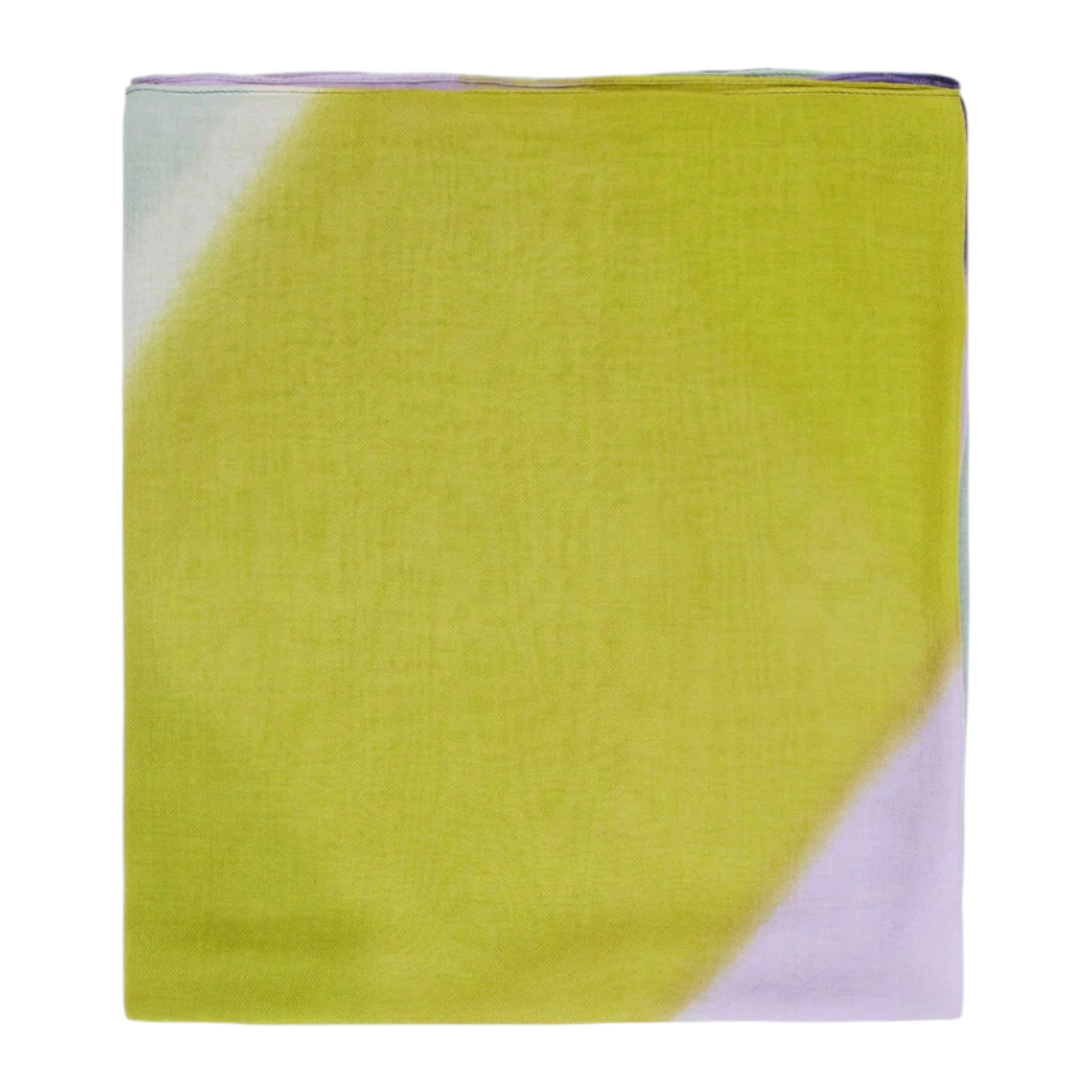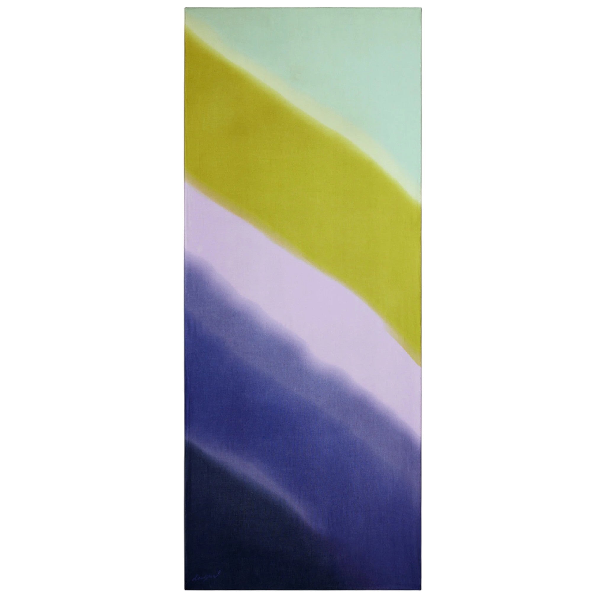 Questo grande foulard rettangolare è impreziosito da una stampa Arty a righe diagonali che gioca con una palette di verde, lilla, viola e blu, creando un effetto dinamico e contemporaneo.