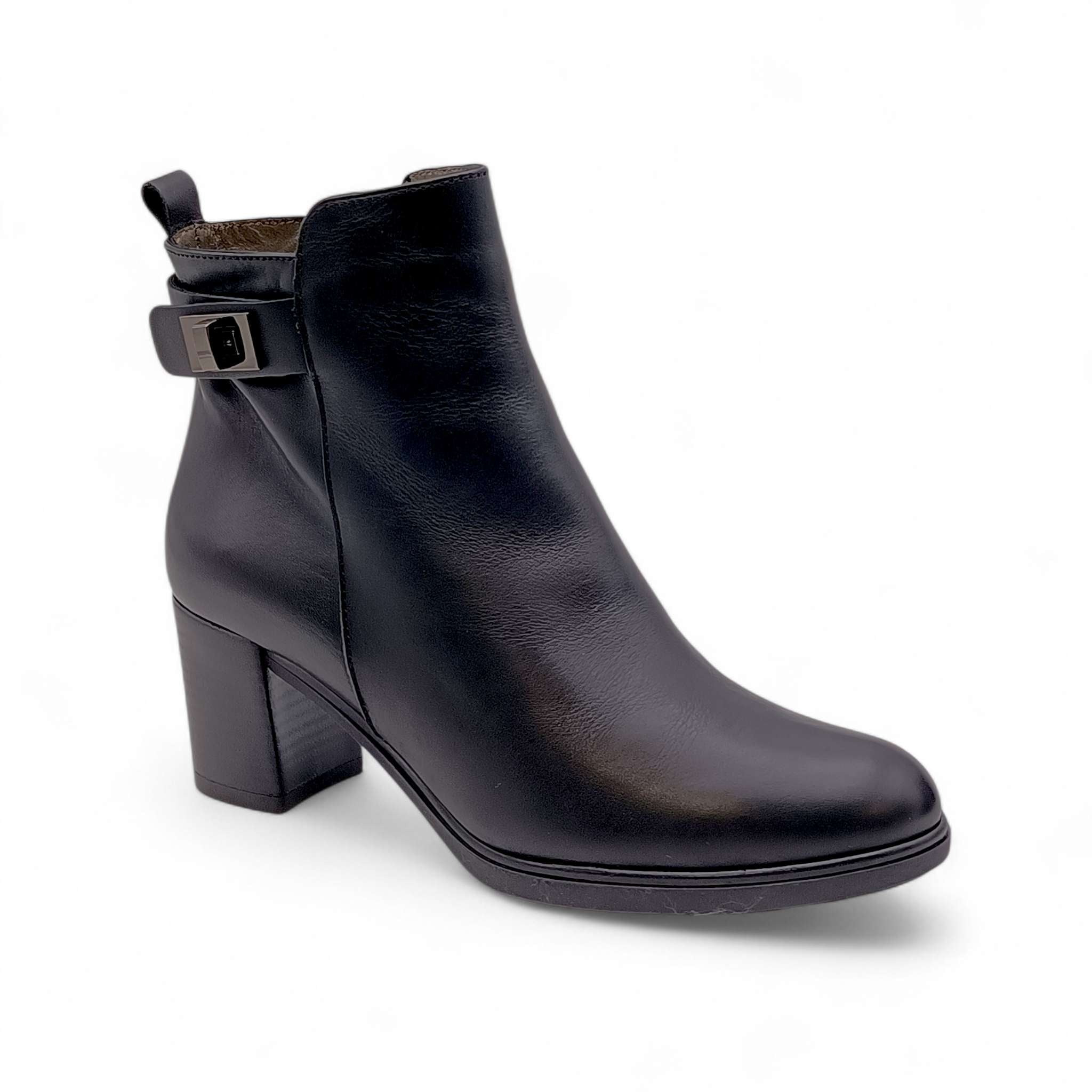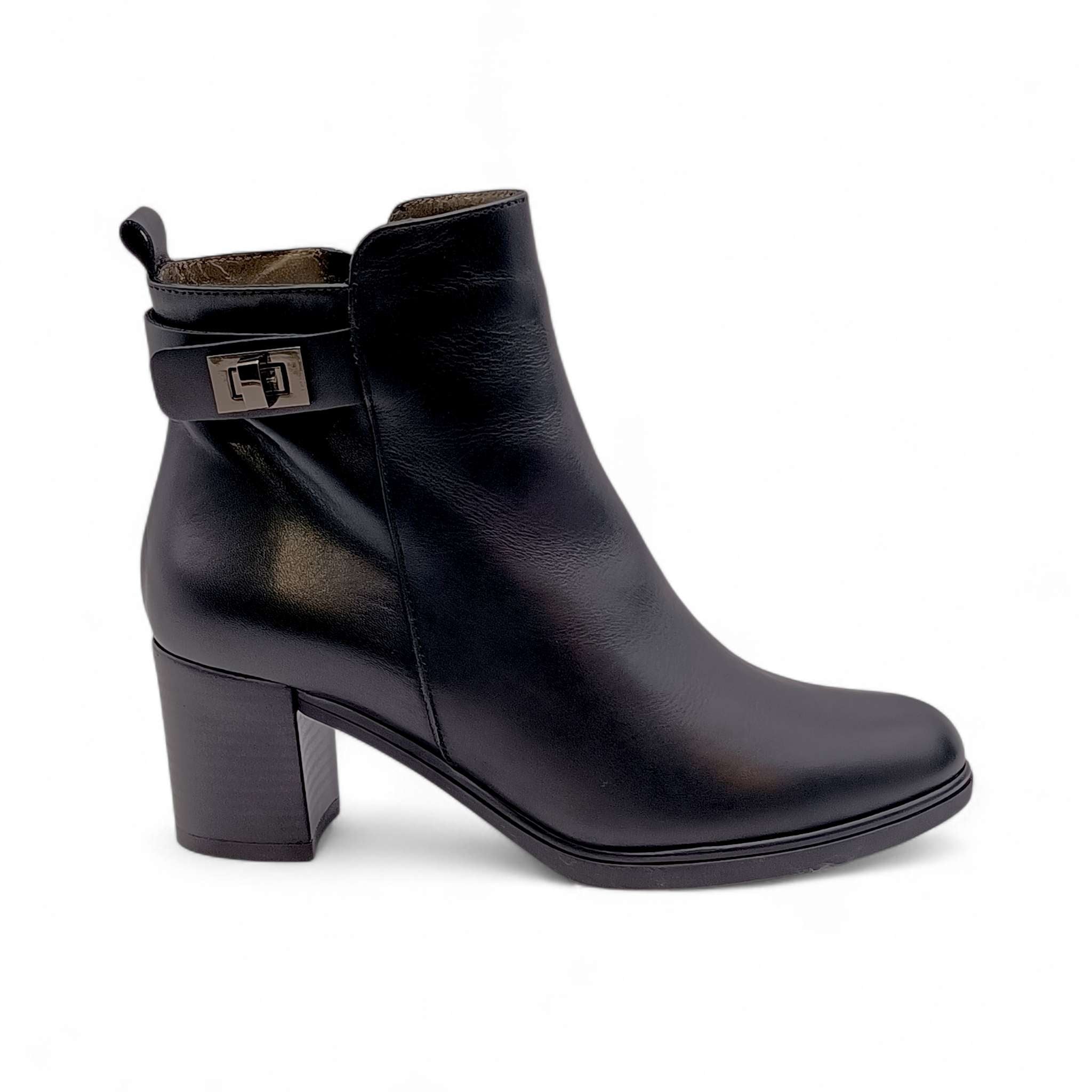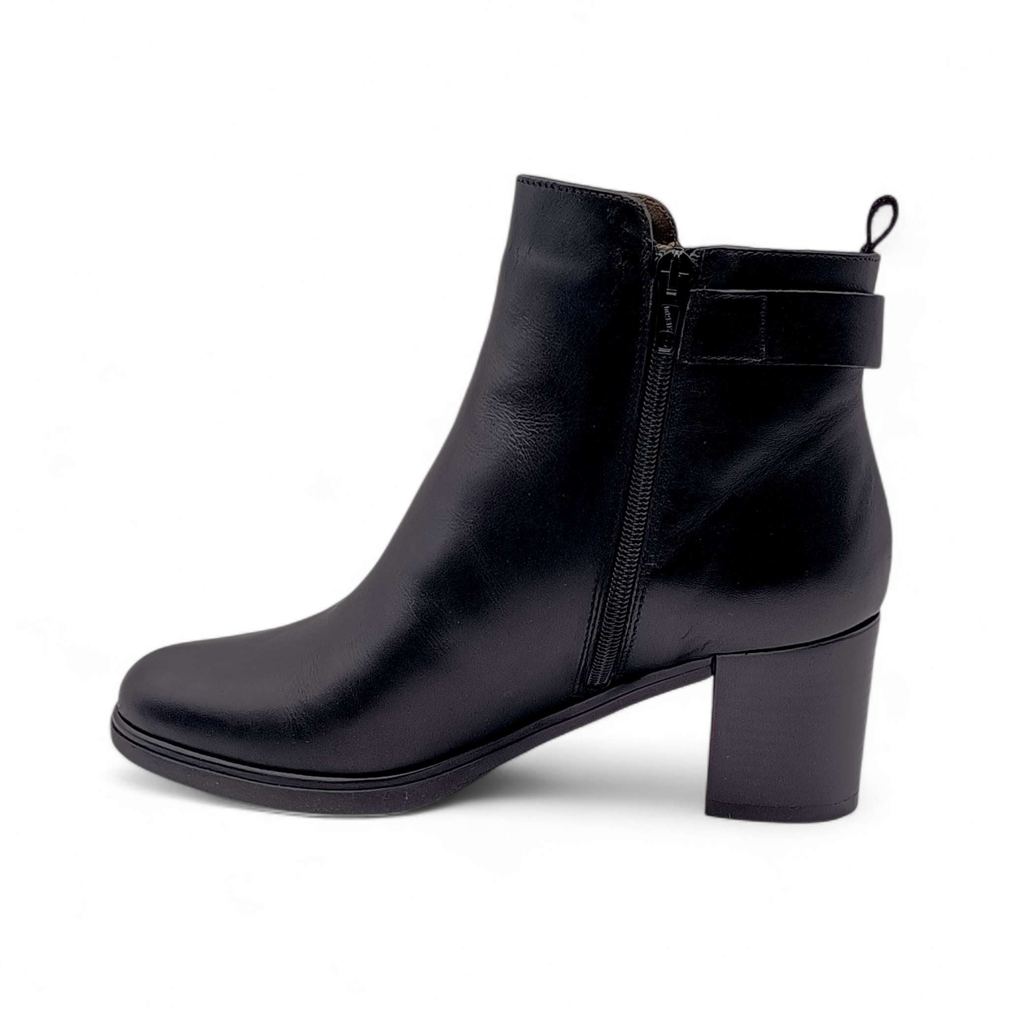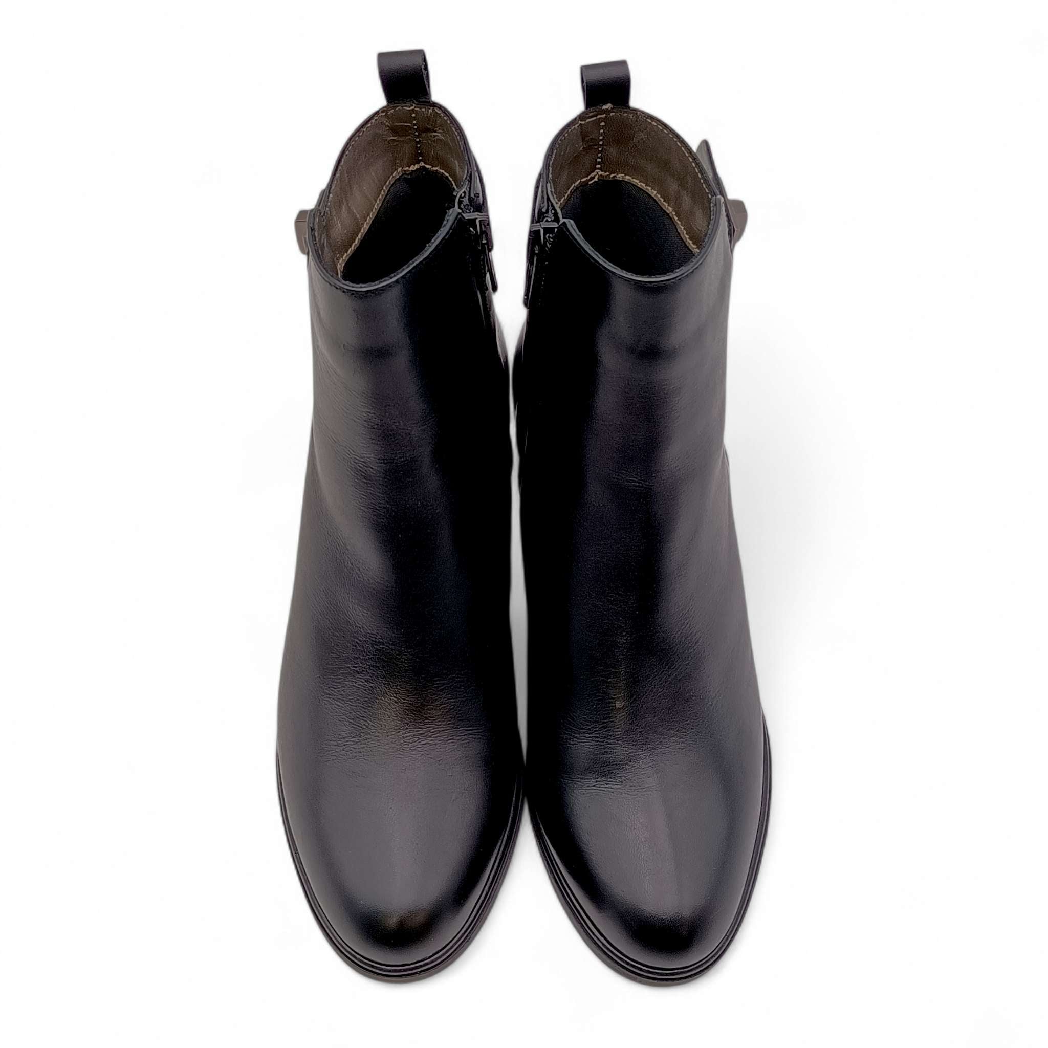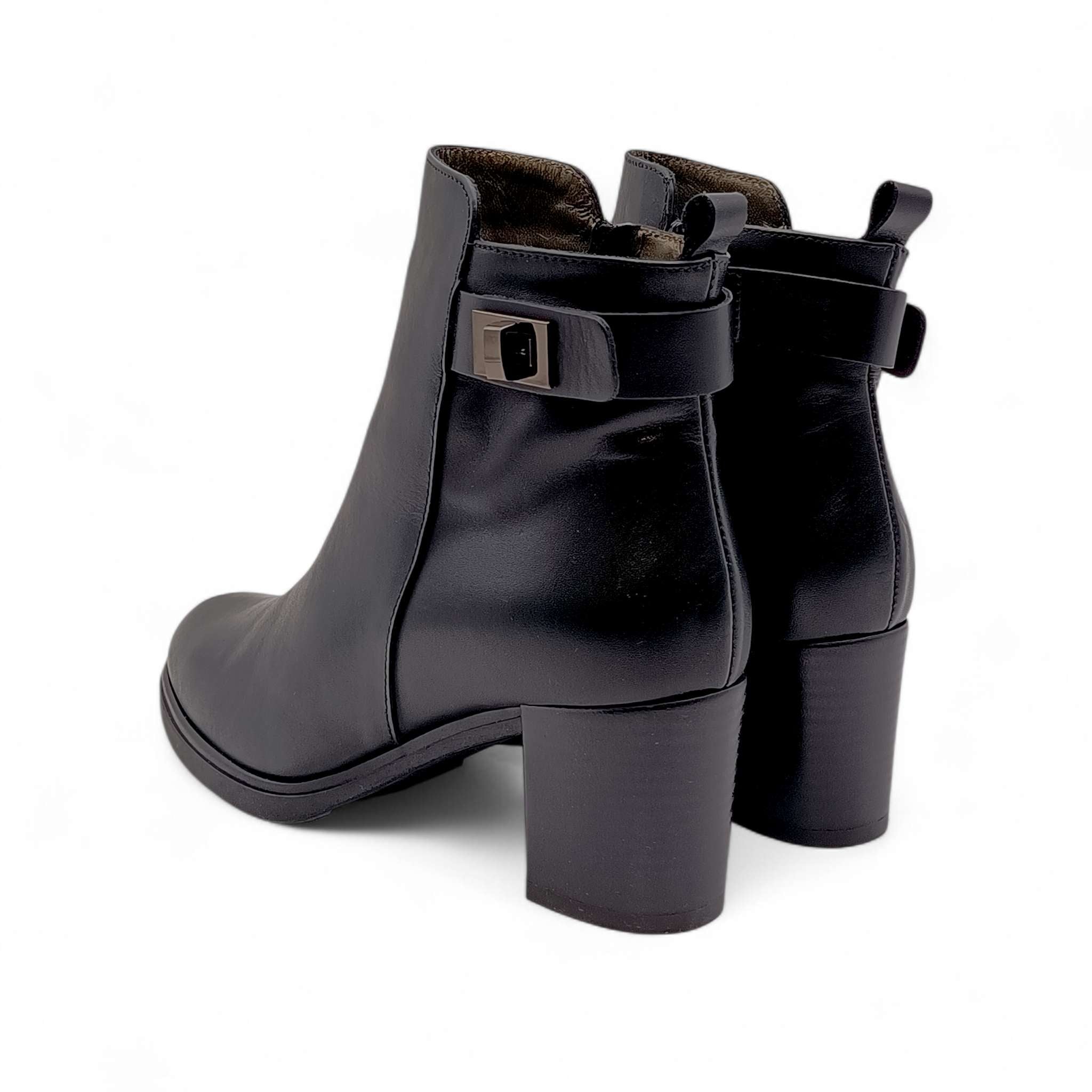 Stivaletto in pelle liscia nera con tacco, che da slancio alla caviglia.