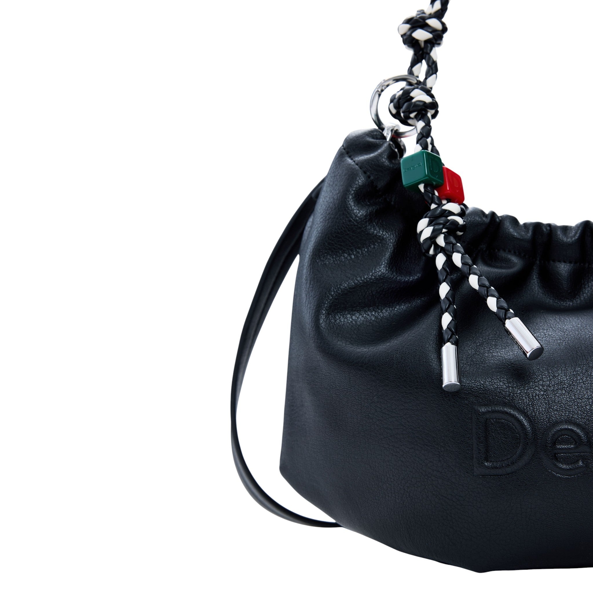 La silhouette arricciata dona volume e carattere, mentre il manico in corda intrecciata con nodi decorativi aggiunge un tocco distintivo.