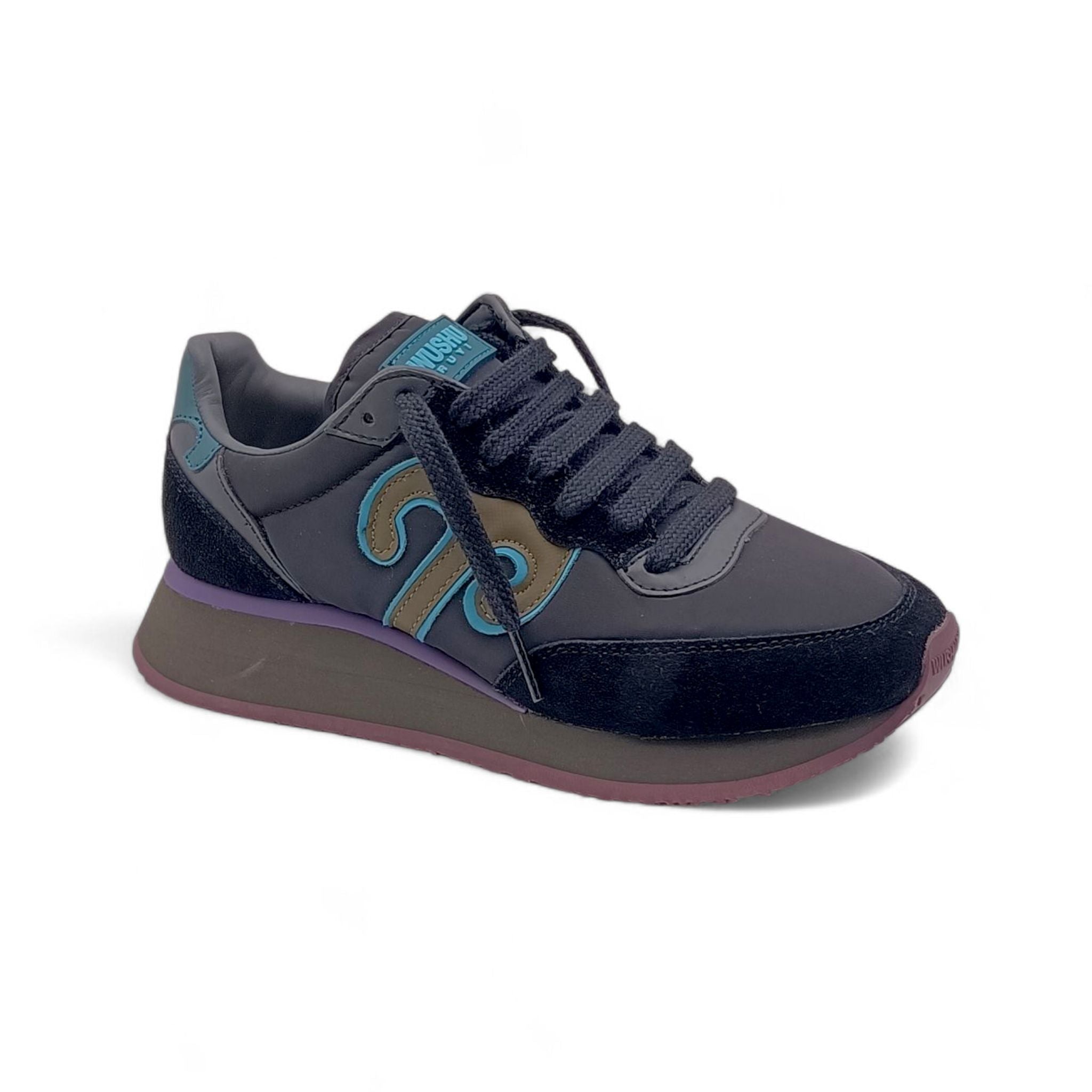 Una scarpa fashion nera con dettagli colorati che la illuminano, perfetta per completare un look in stile urban.