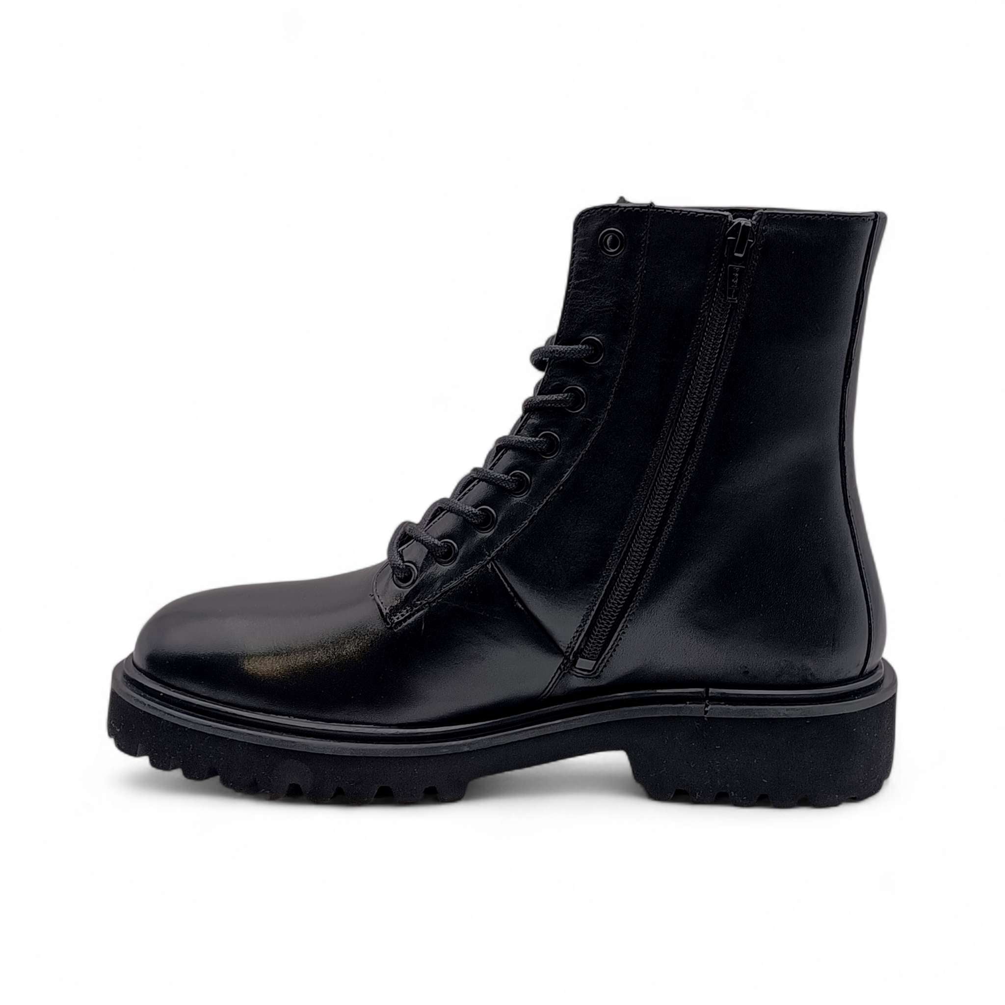 Stivaletto combat urbano con tomaia realizzata in robusta pelle anfibia.