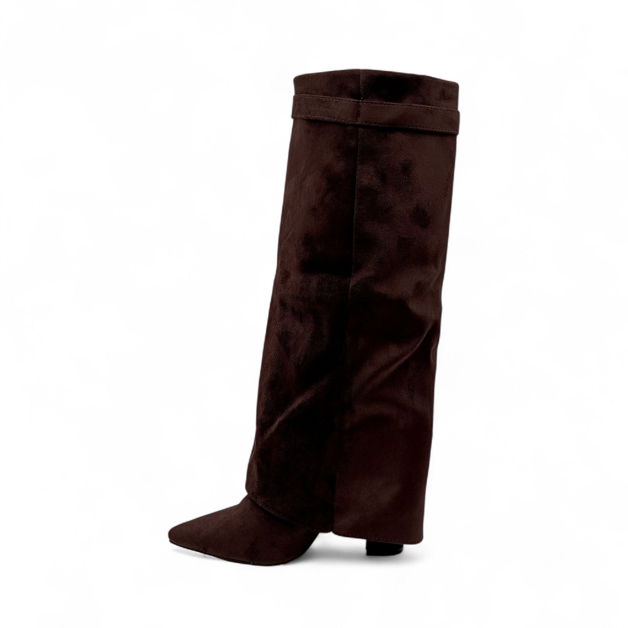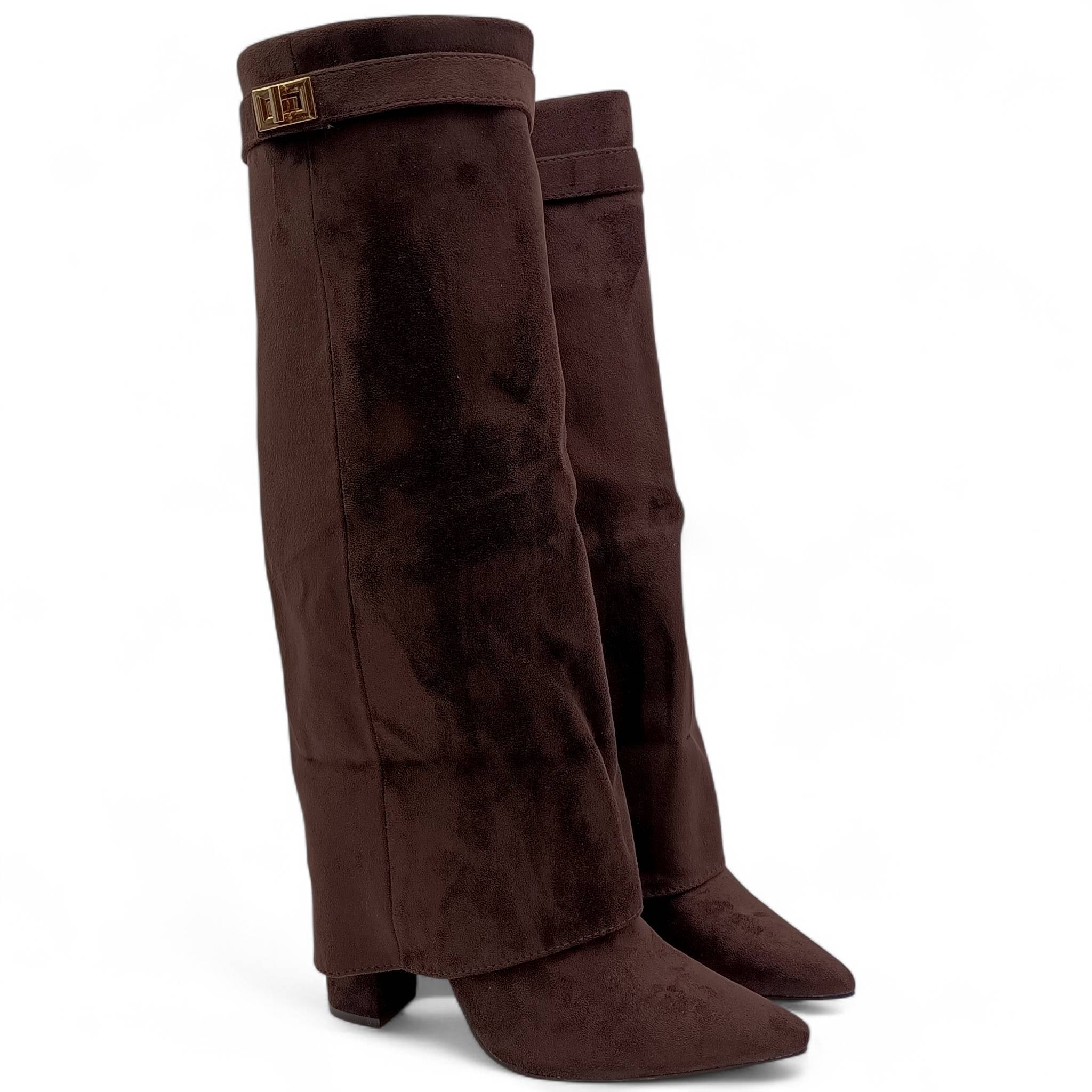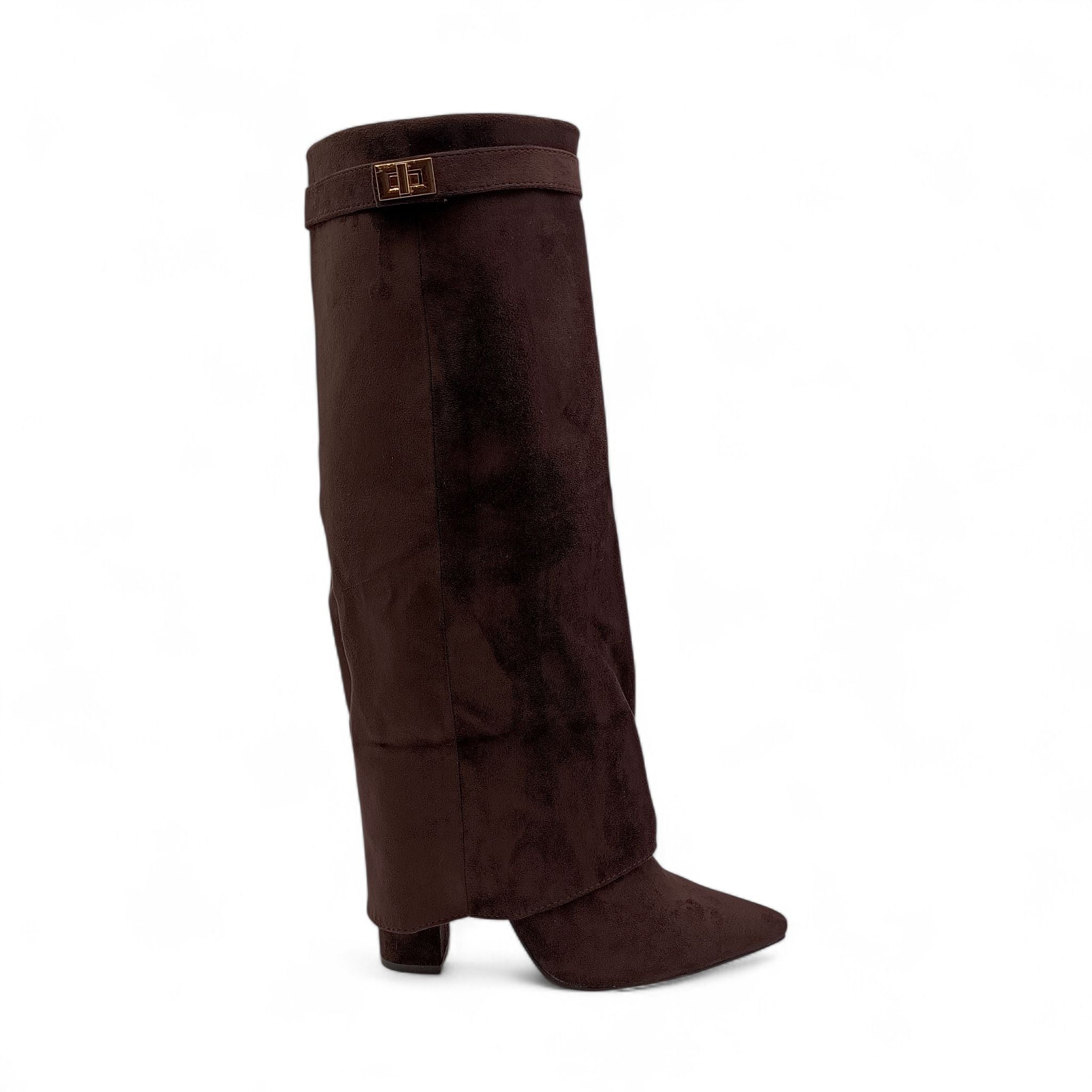 Eleganza senza tempo e comfort si incontrano nello stivale Claudia. Realizzato in morbido camoscio brown, questo stivale a tubo alto slancia la figura grazie alla punta affusolata e alla silhouette pulita. Il dettaglio metallico dorato, posto sul bordo superiore, aggiunge un tocco sofisticato senza risultare eccessivo.