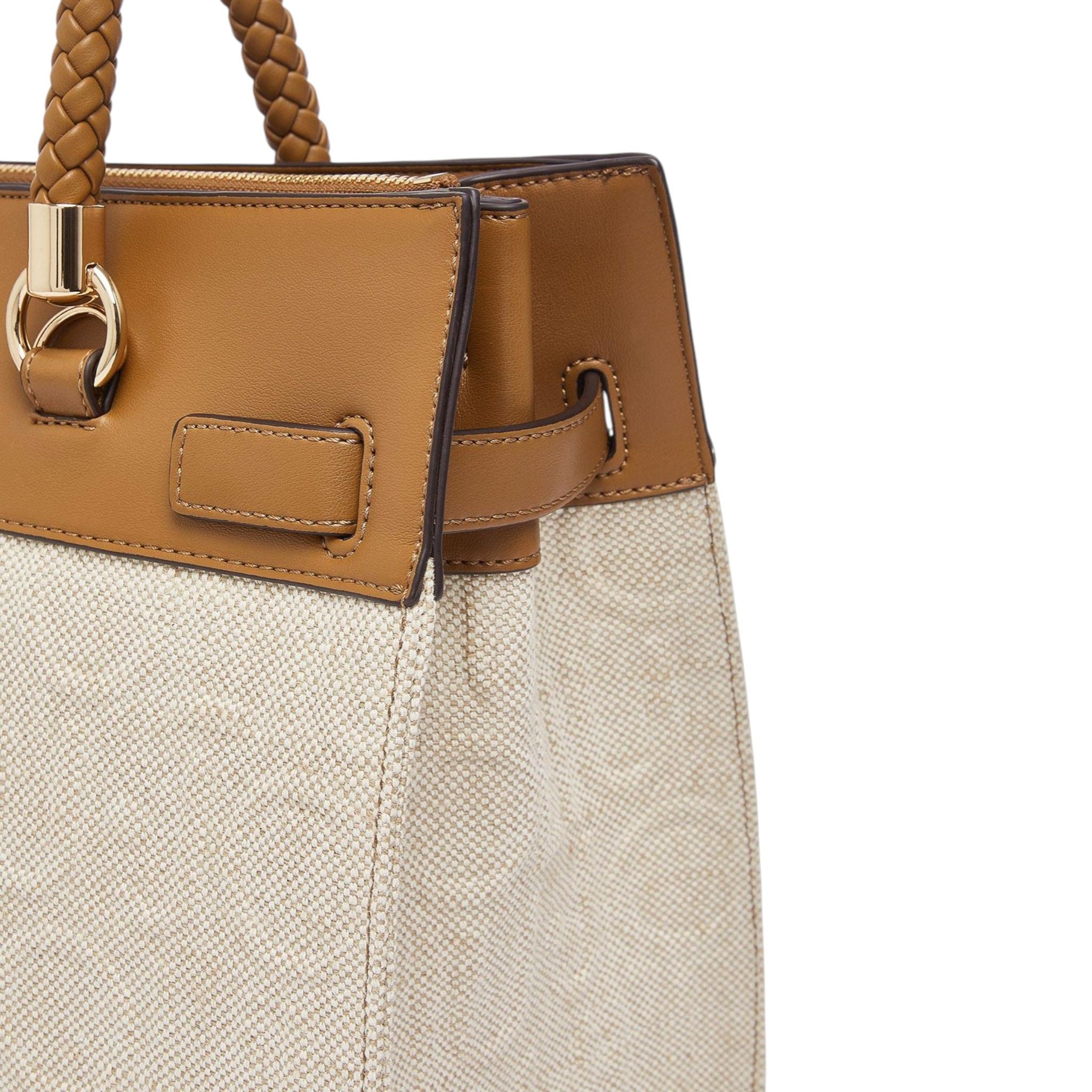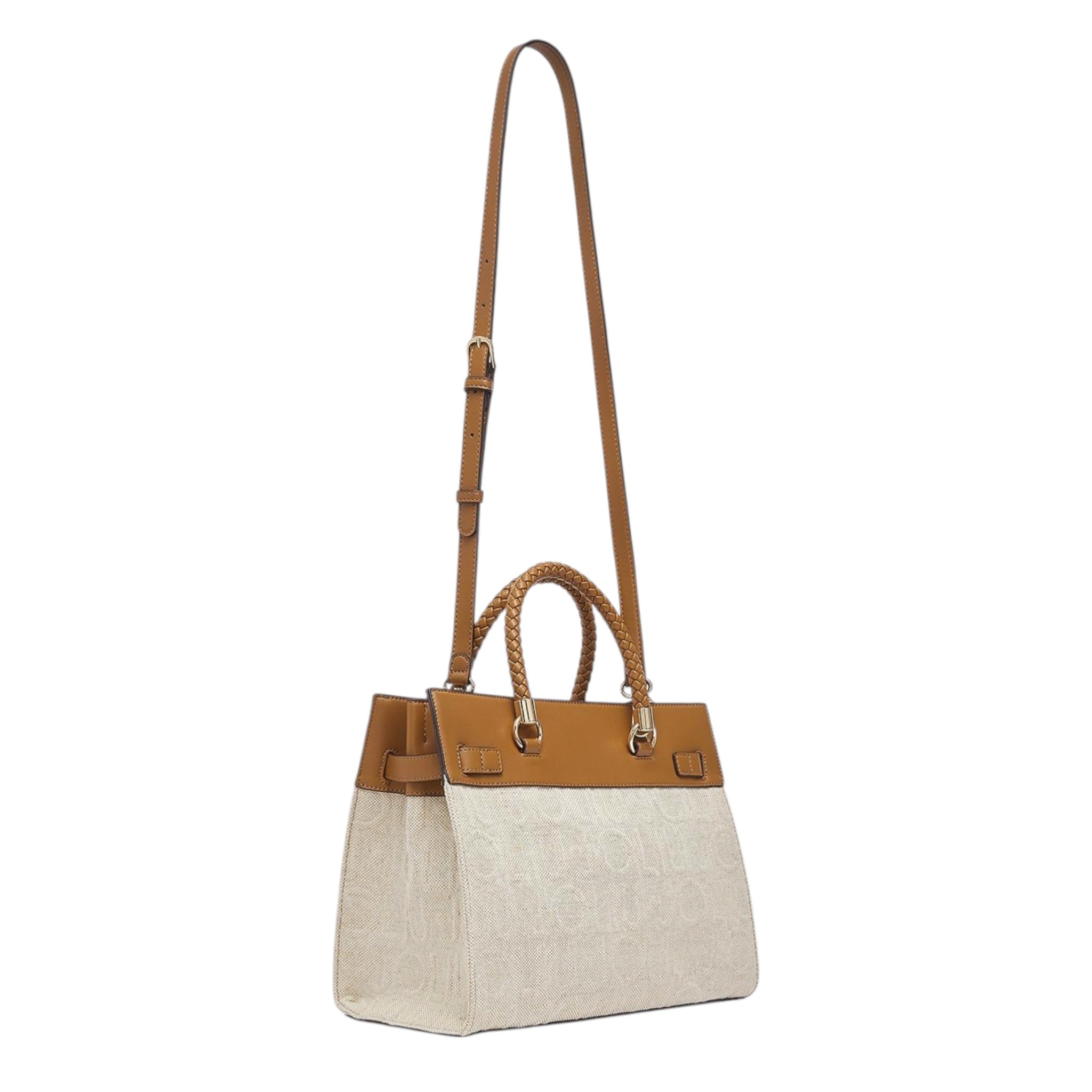 Realizzata in tessuto logato e in ecopelle color cuoio, questa borsa offre una texture resistente e leggera ideale per l’uso quotidiano.