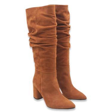 Stivale da donna in camoscio arricciato con tacco alto e tomaia a punta.