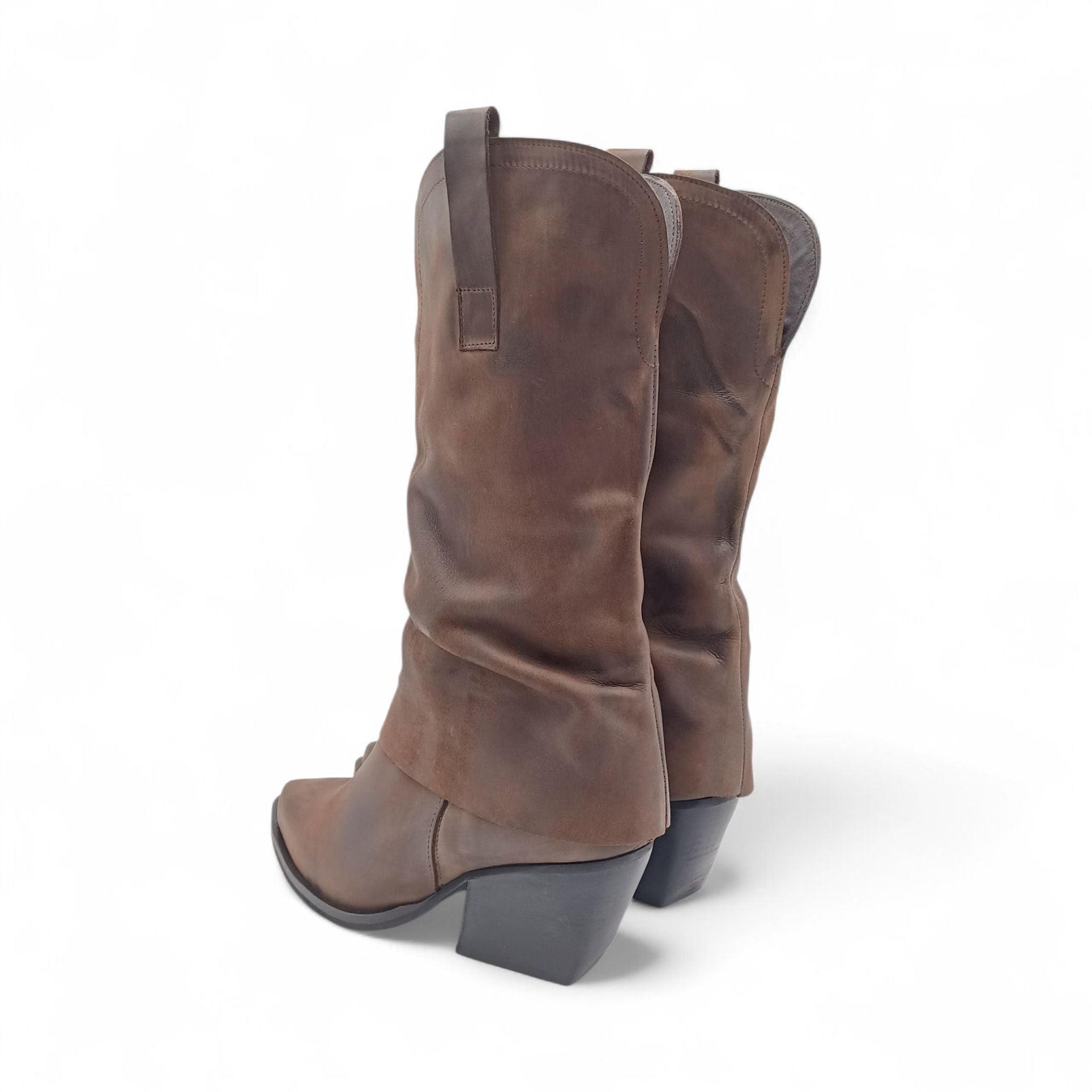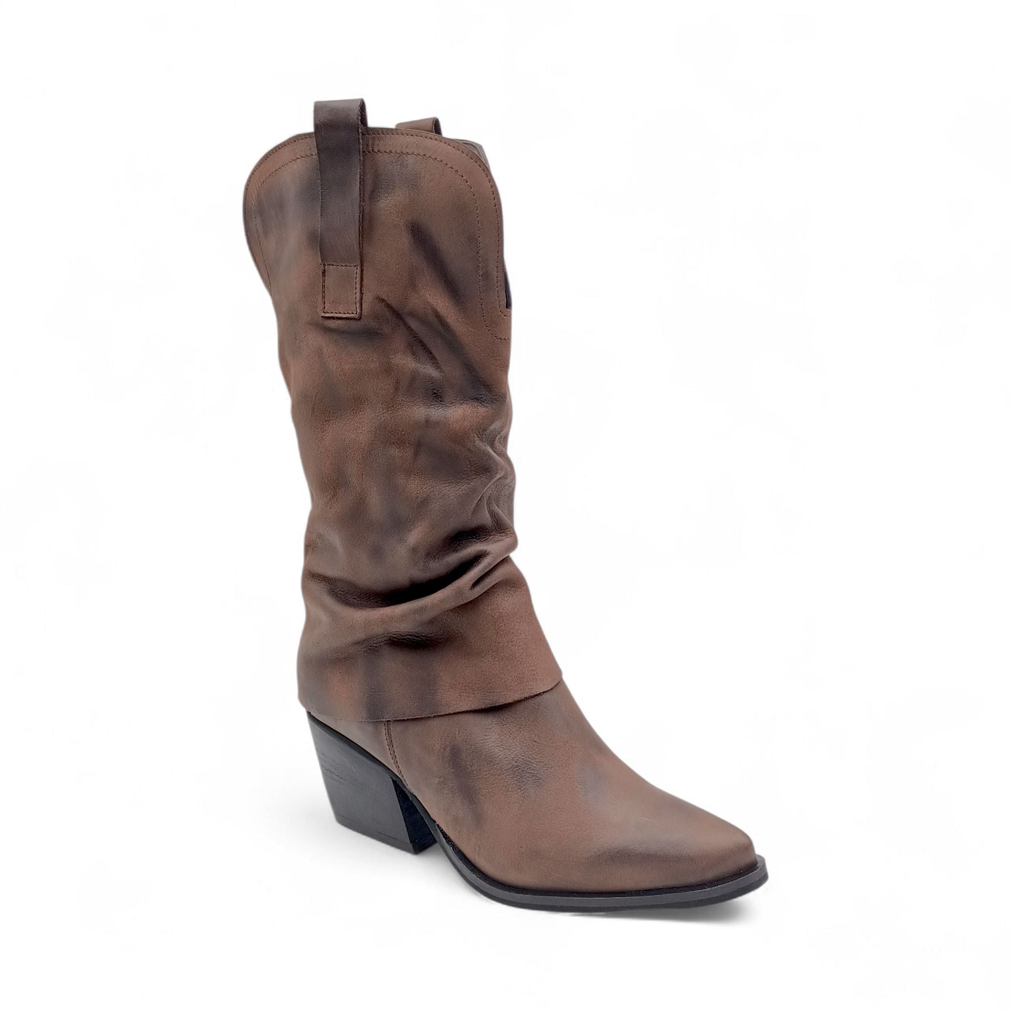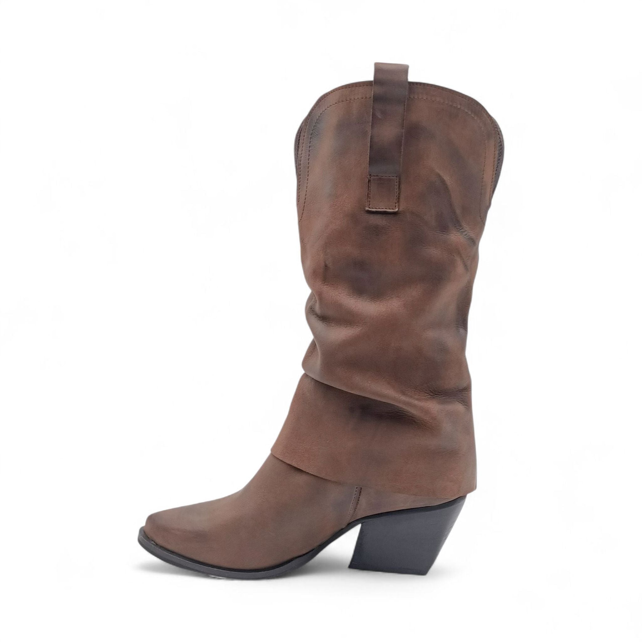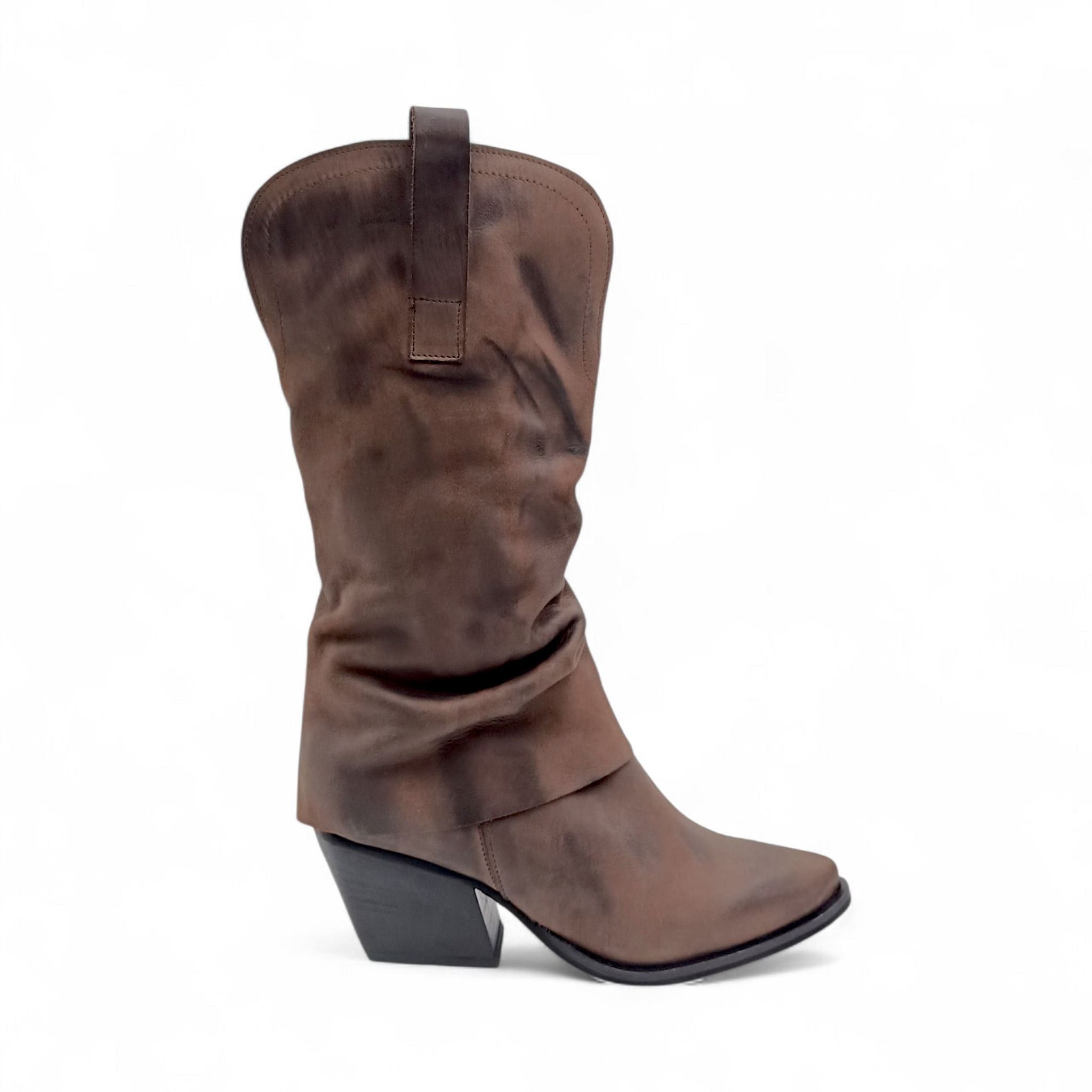 Realizzato in morbida pelle effetto vintage, in color testa di moro questo stivale texano unisce stile e comfort in un design senza tempo.