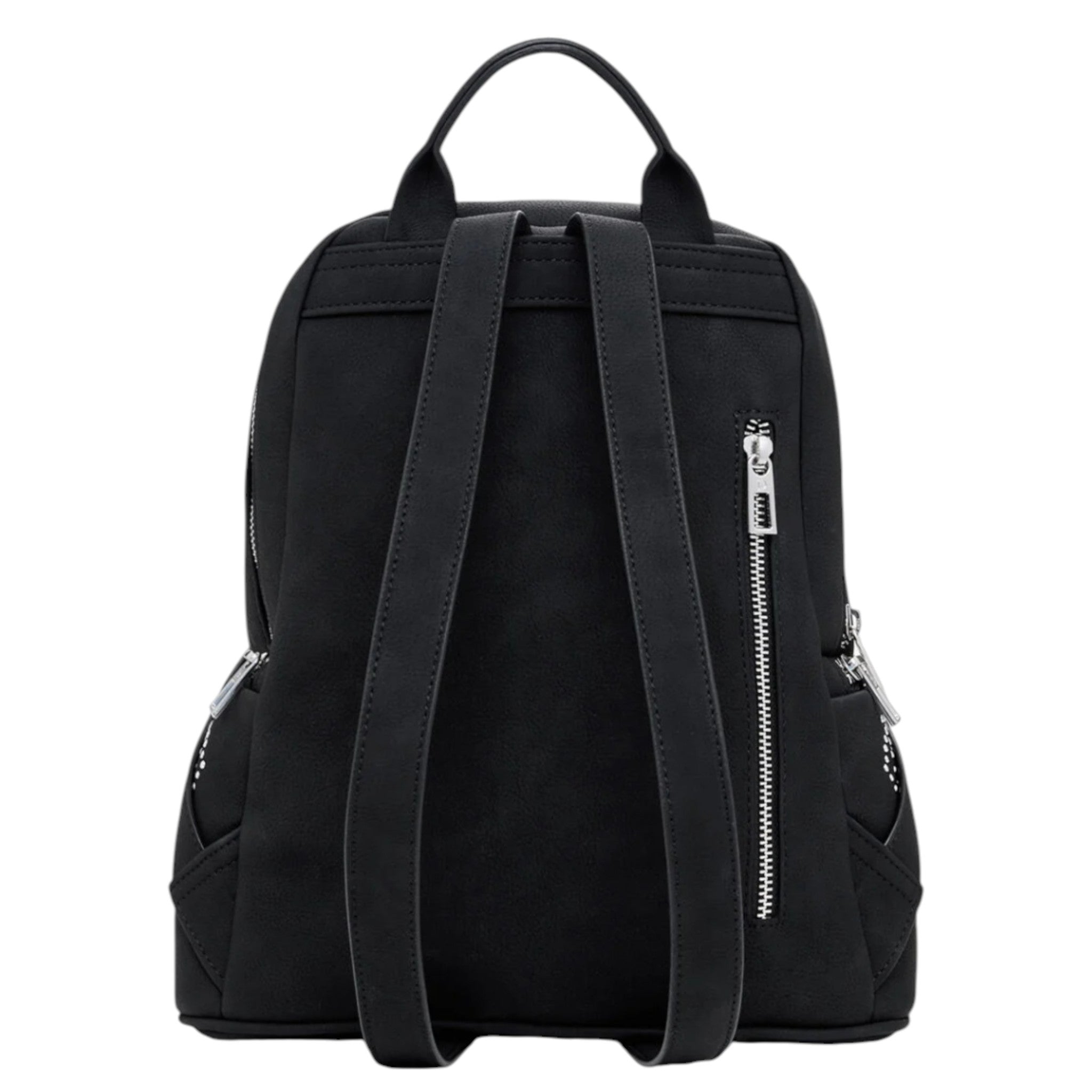 Questo zaino piccolo Desigual in effetto pelle nera si distingue per i dettagli di borchie metalliche che donano un tocco grintoso e contemporaneo.