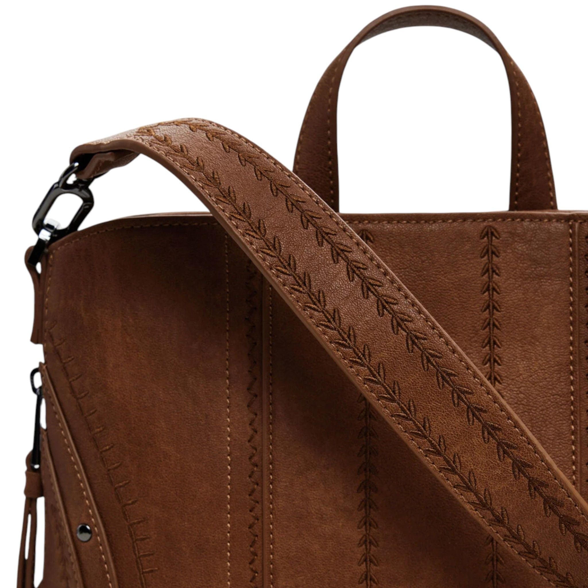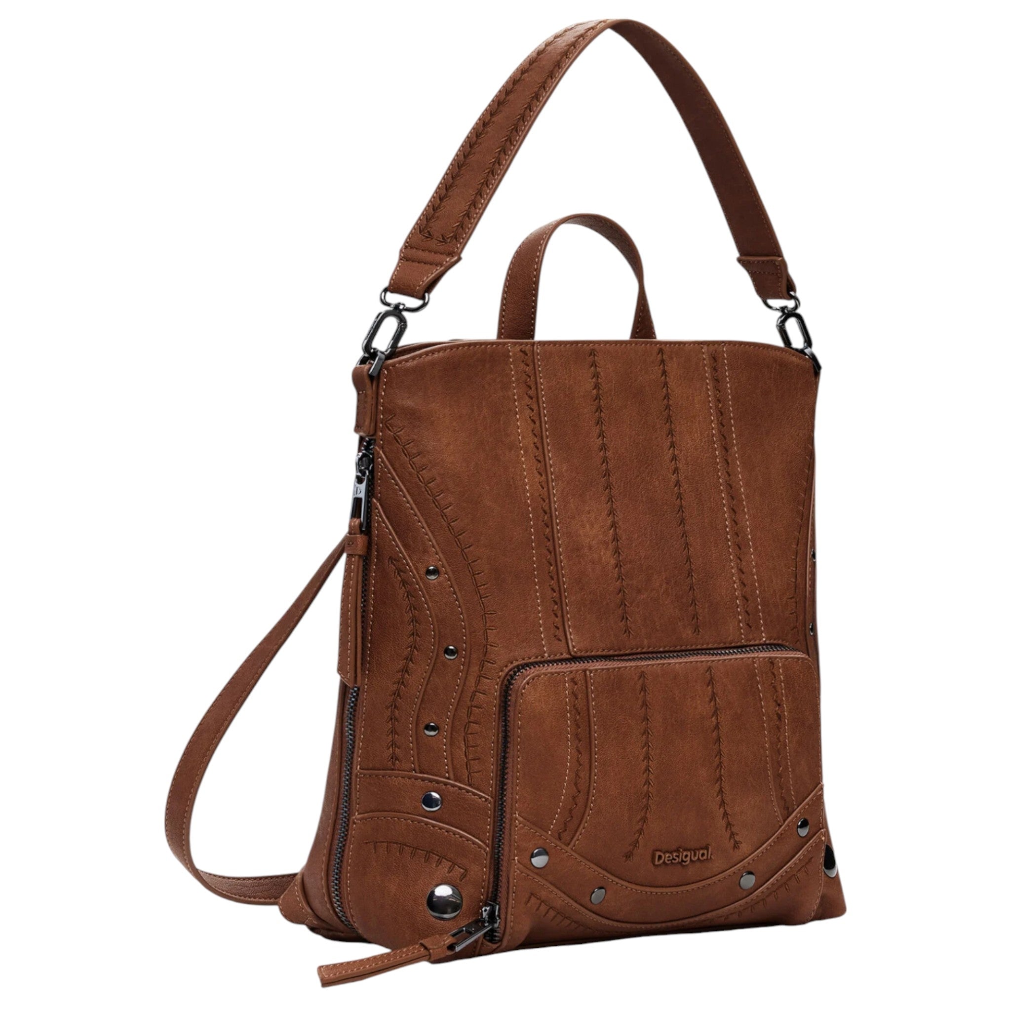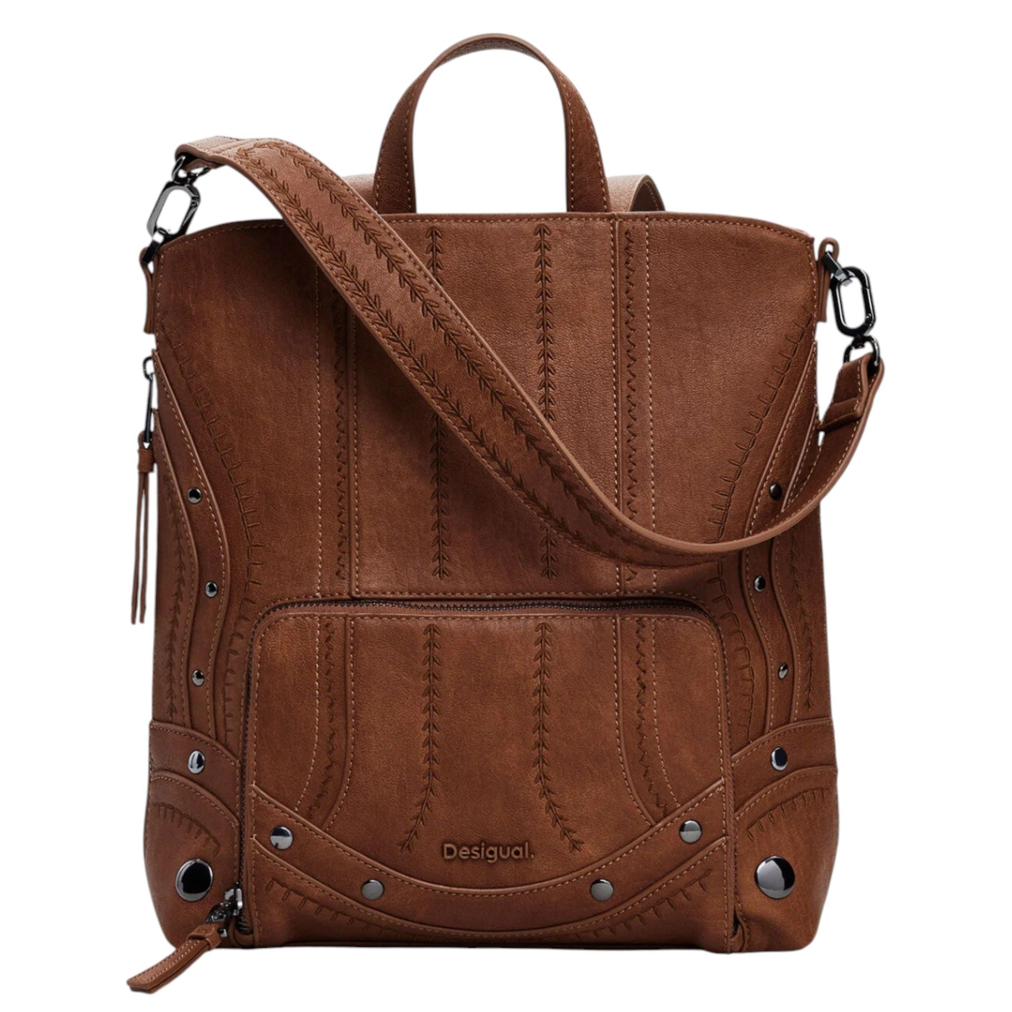 Questo zaino piccolo Desigual in effetto pelle color camel si distingue per i suoi tessuti ricamati effetto patch e i dettagli di borchie metalliche che donano un tocco deciso e contemporaneo.