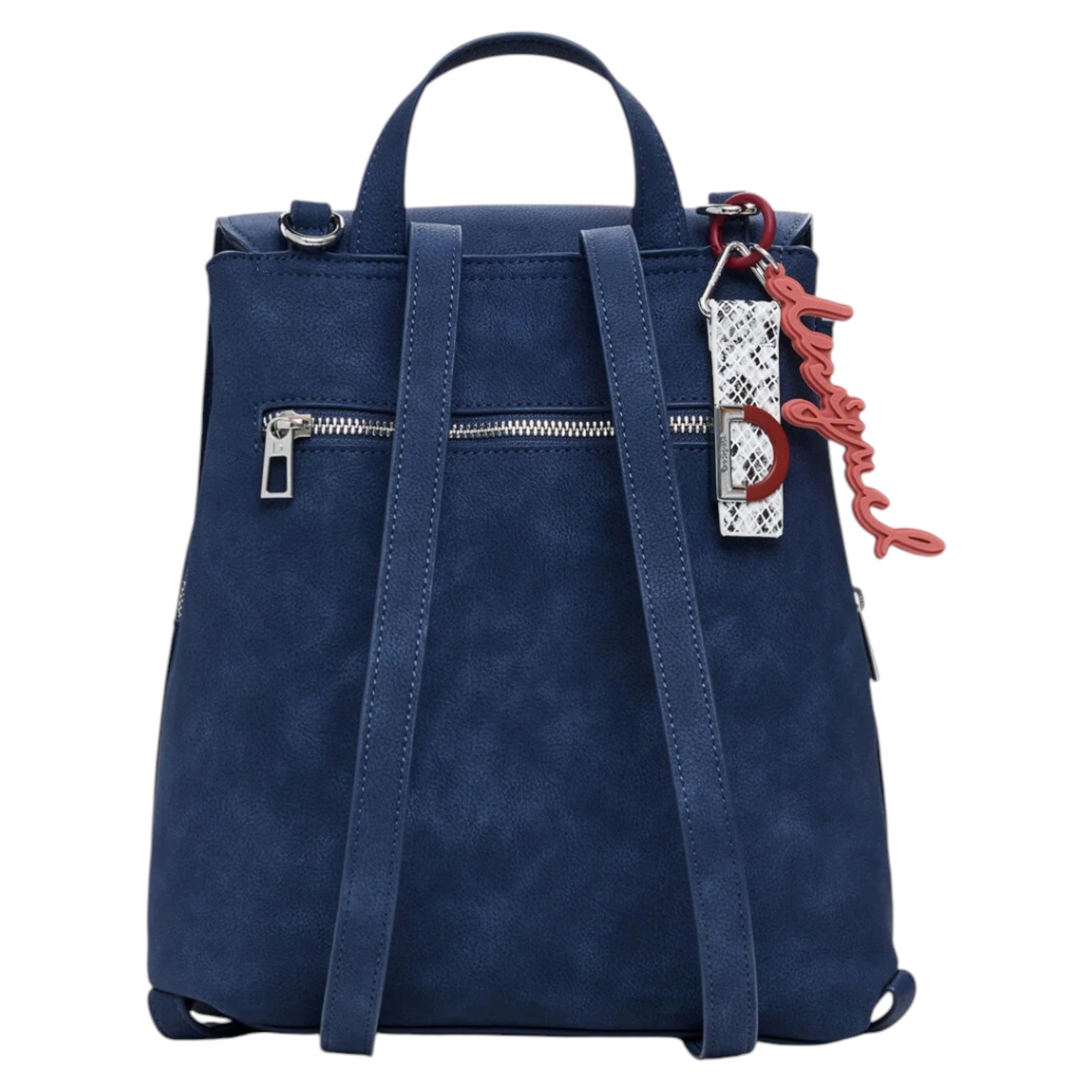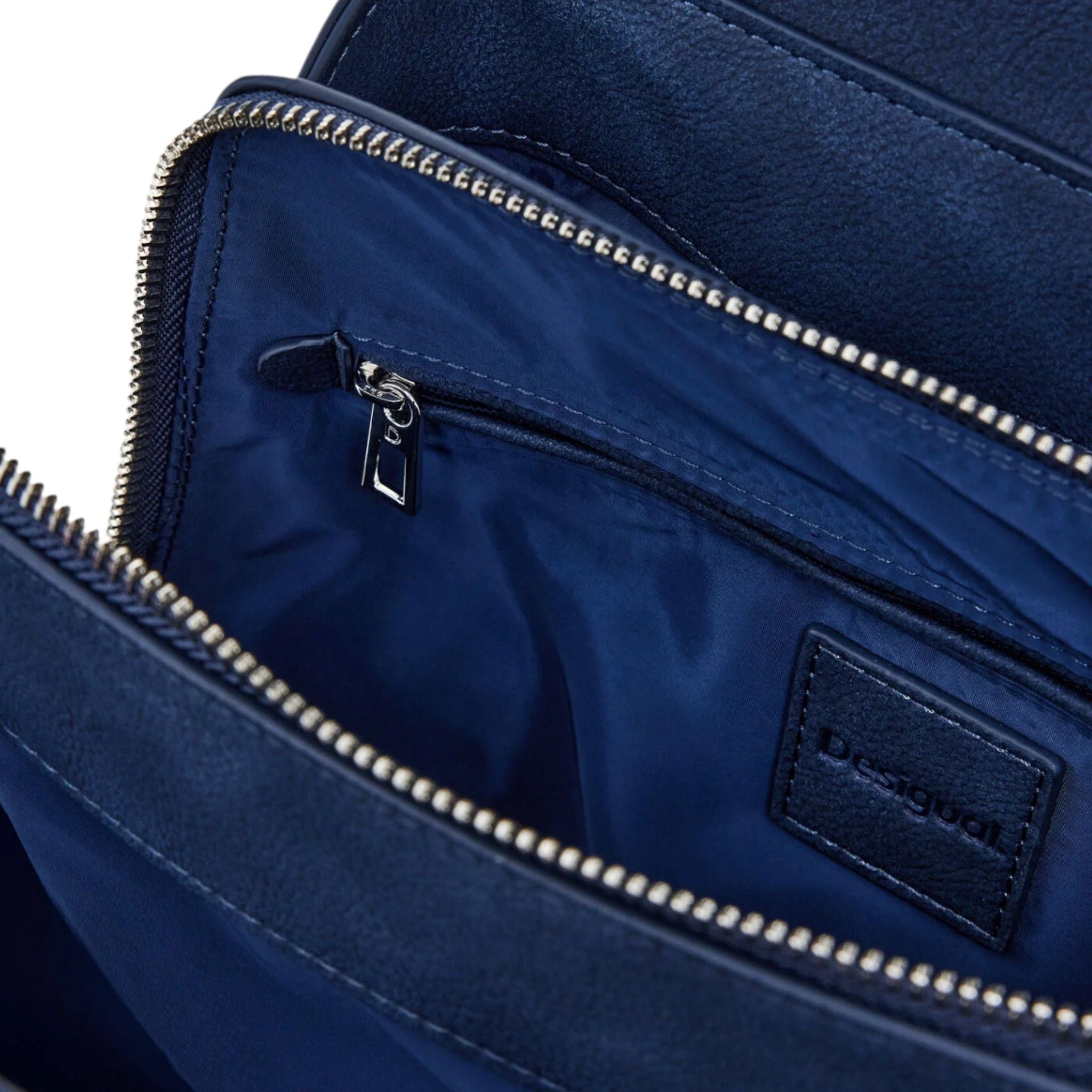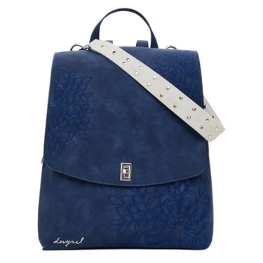 Questo zaino piccolo Desigual in effetto pelle blu si distingue per i suoi mandala incisi e il logo metallico che illumina il design con discreta eleganza.