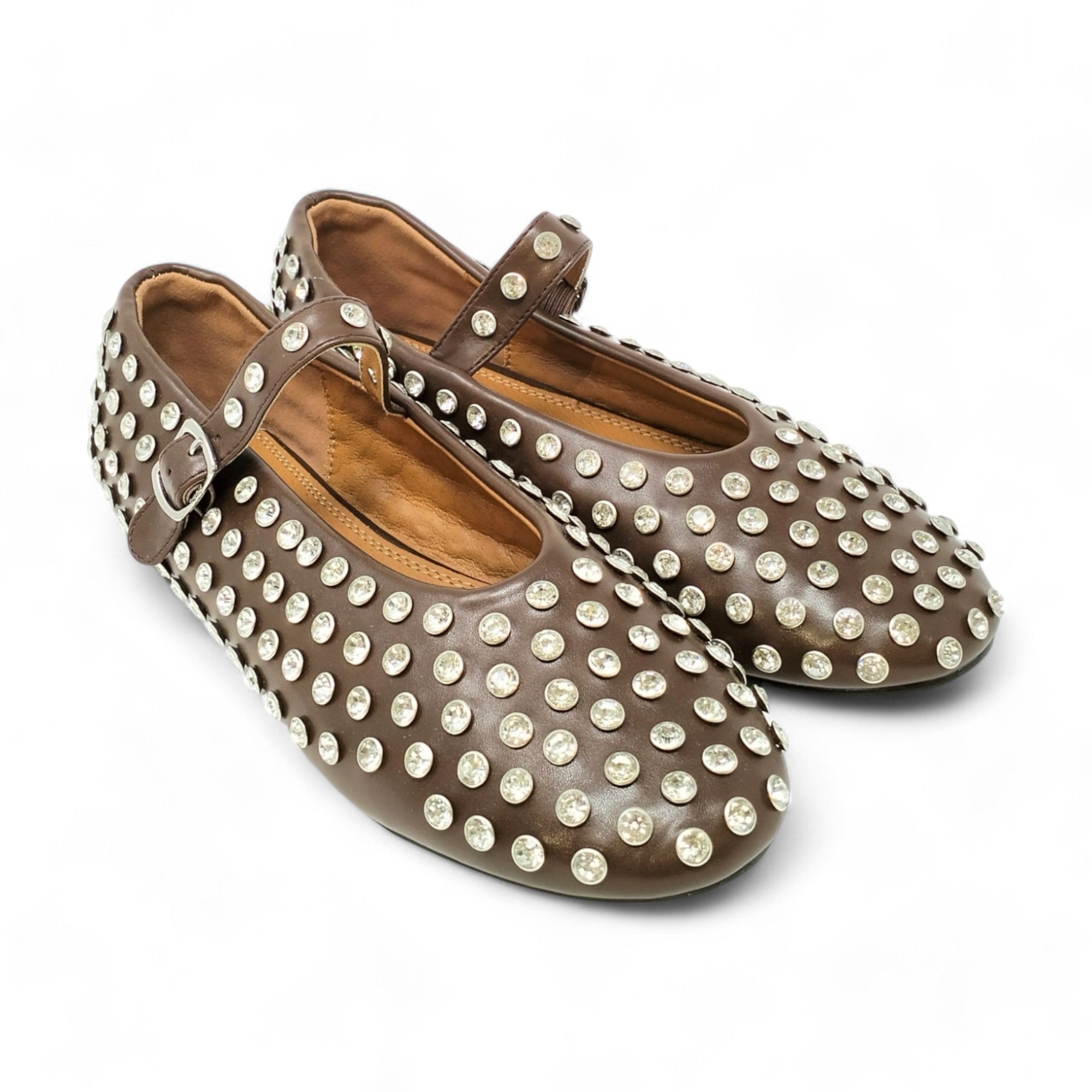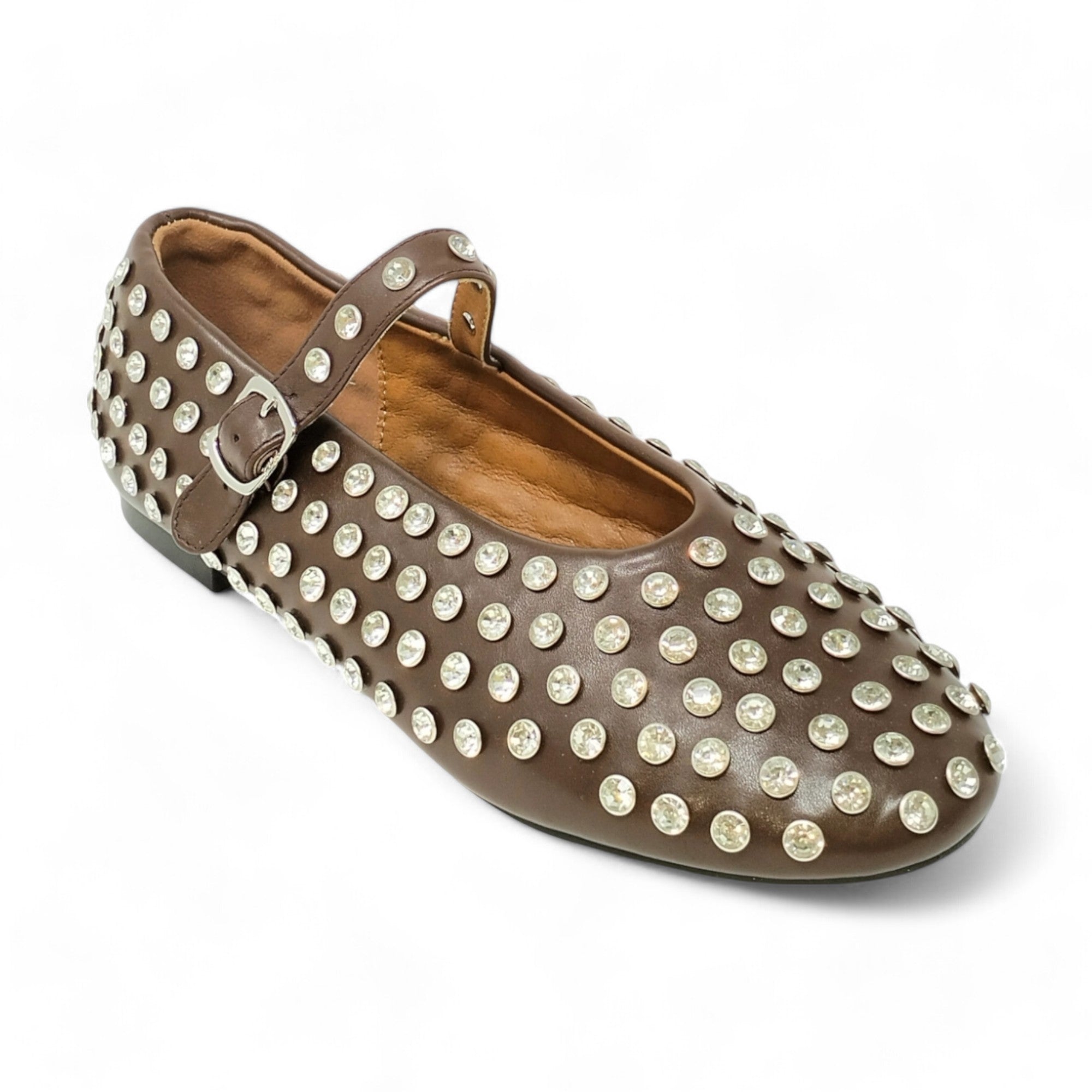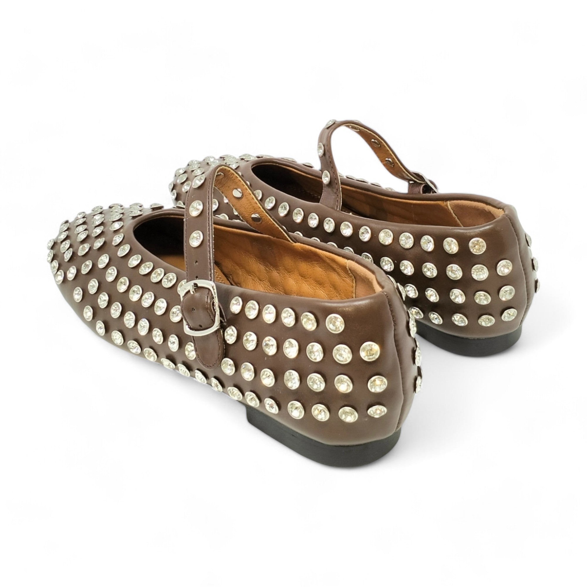 Ballerina realizzata in ecopelle liscia con cristalli trasparenti sulla tomaia.
