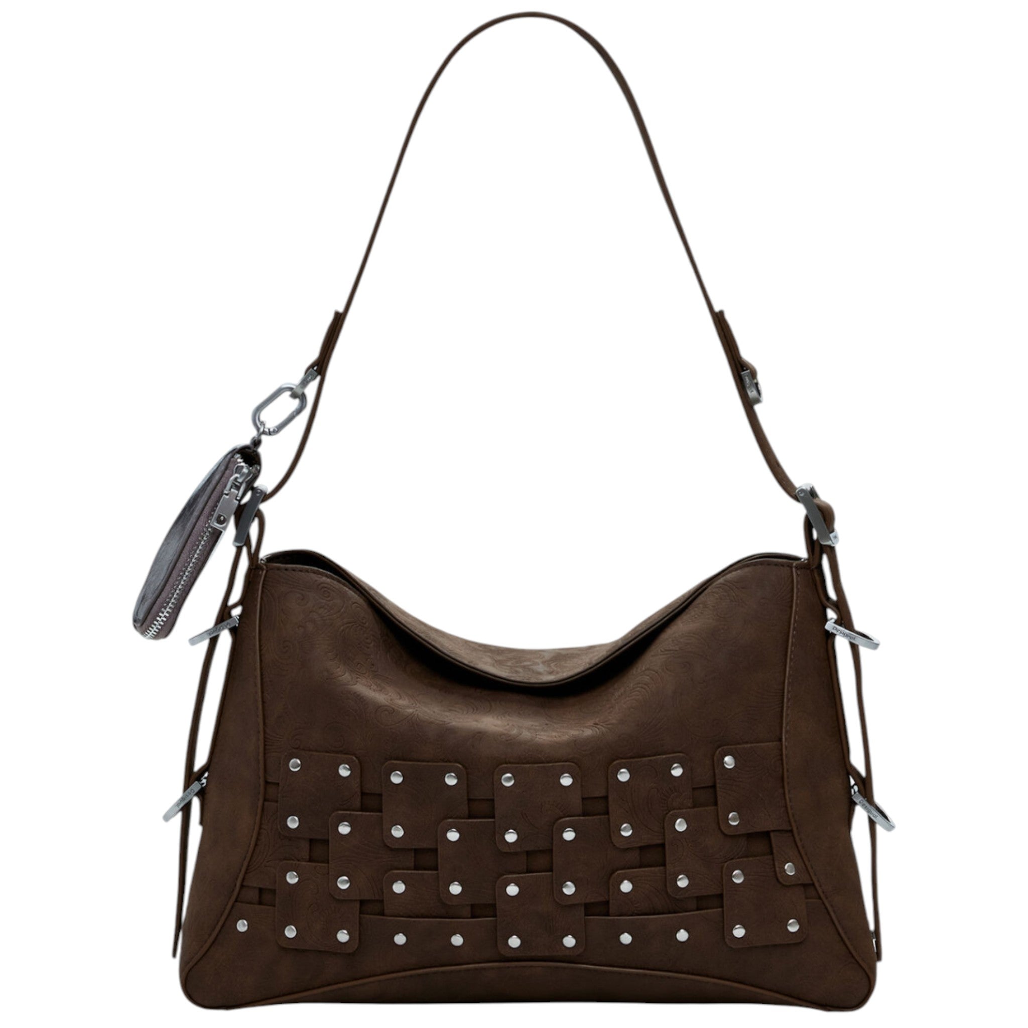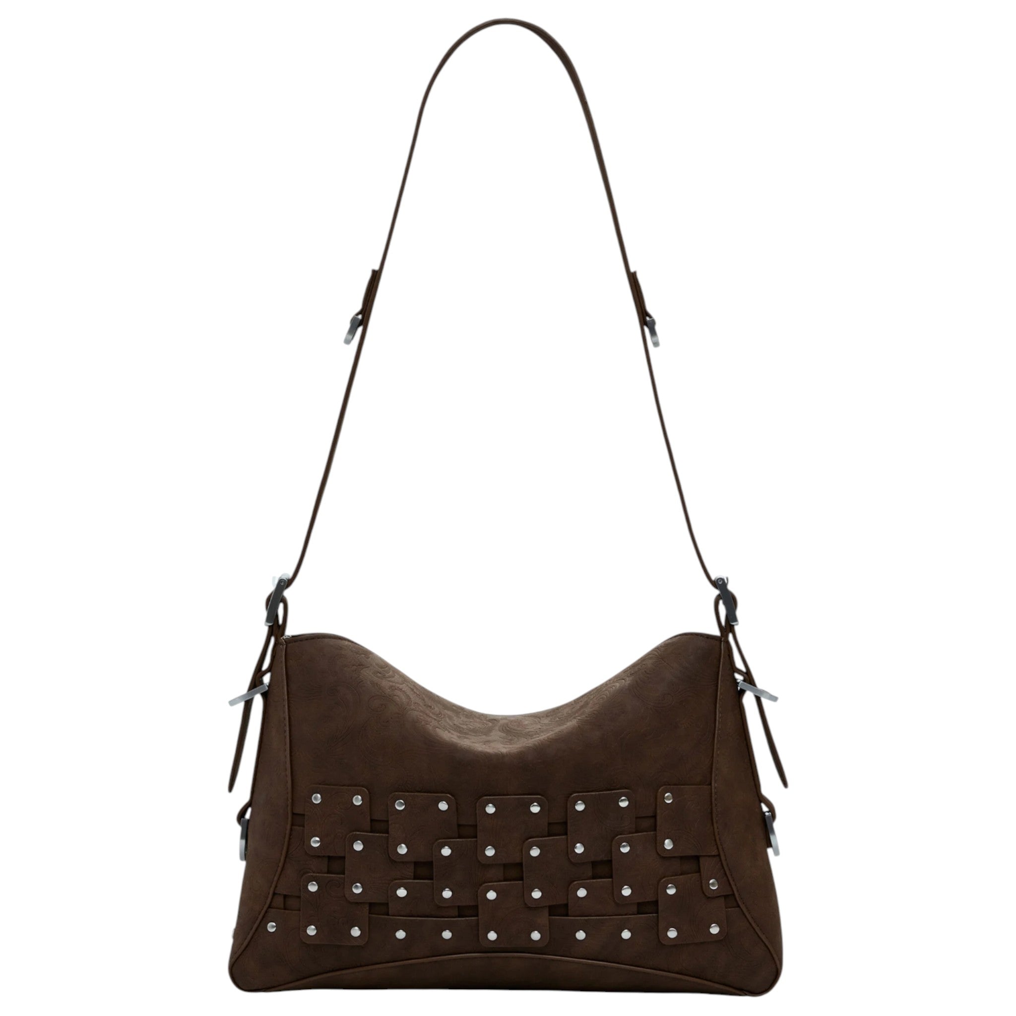 In tessuto effetto pelle, con borchie metalliche e mini-portamonete rimovibile, unisce praticità e personalità.