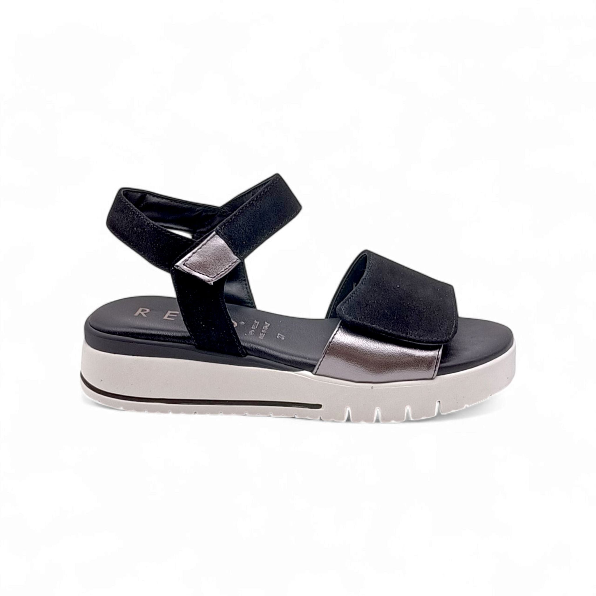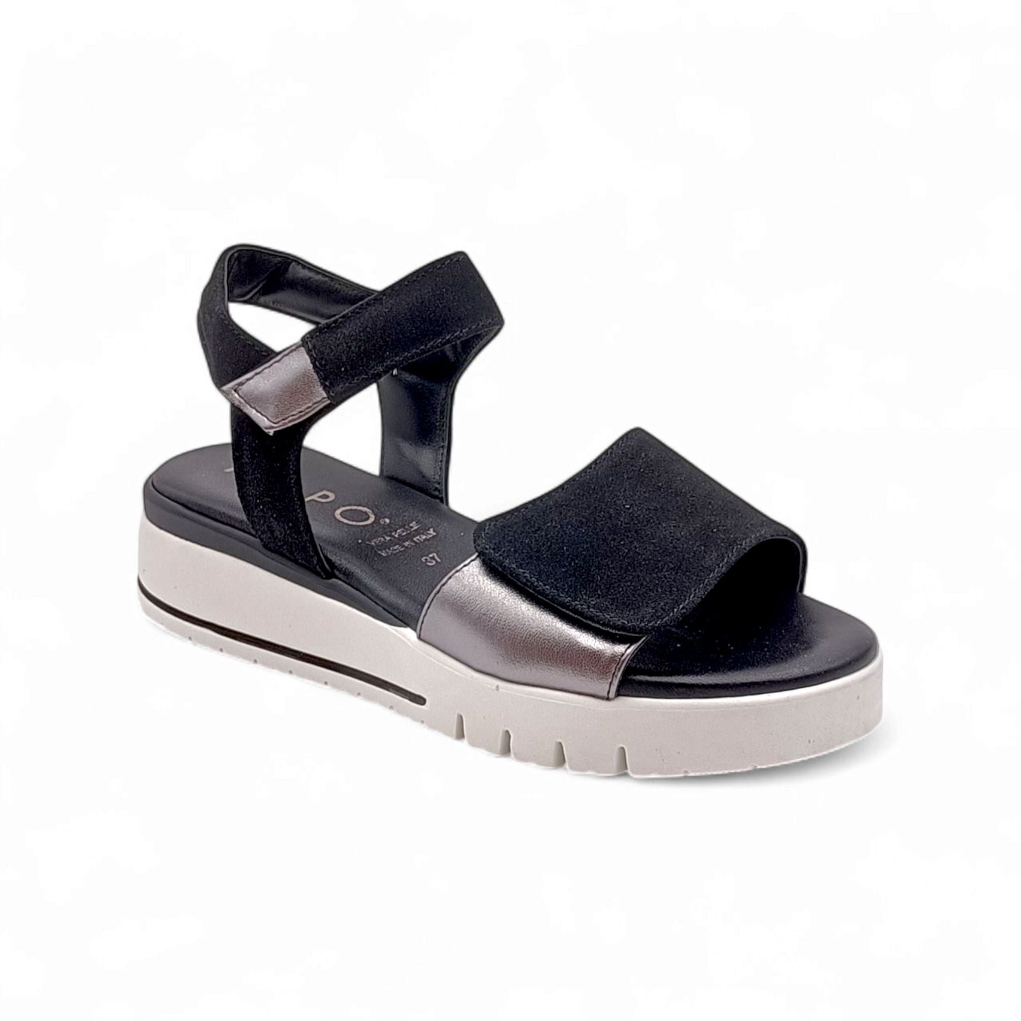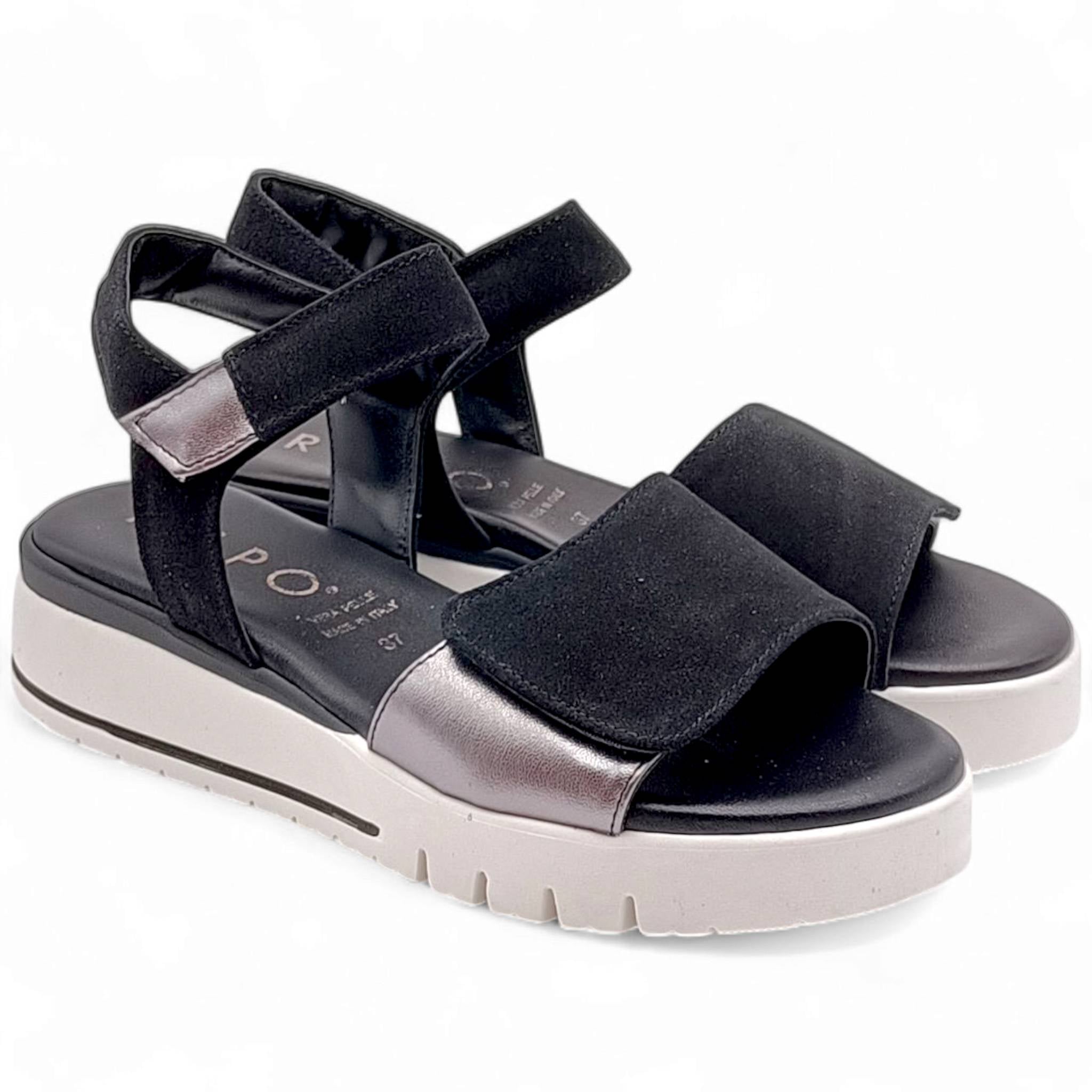Sandalo donna con tomaia in camoscio nero. Arricchito da contrasti luminosi!
