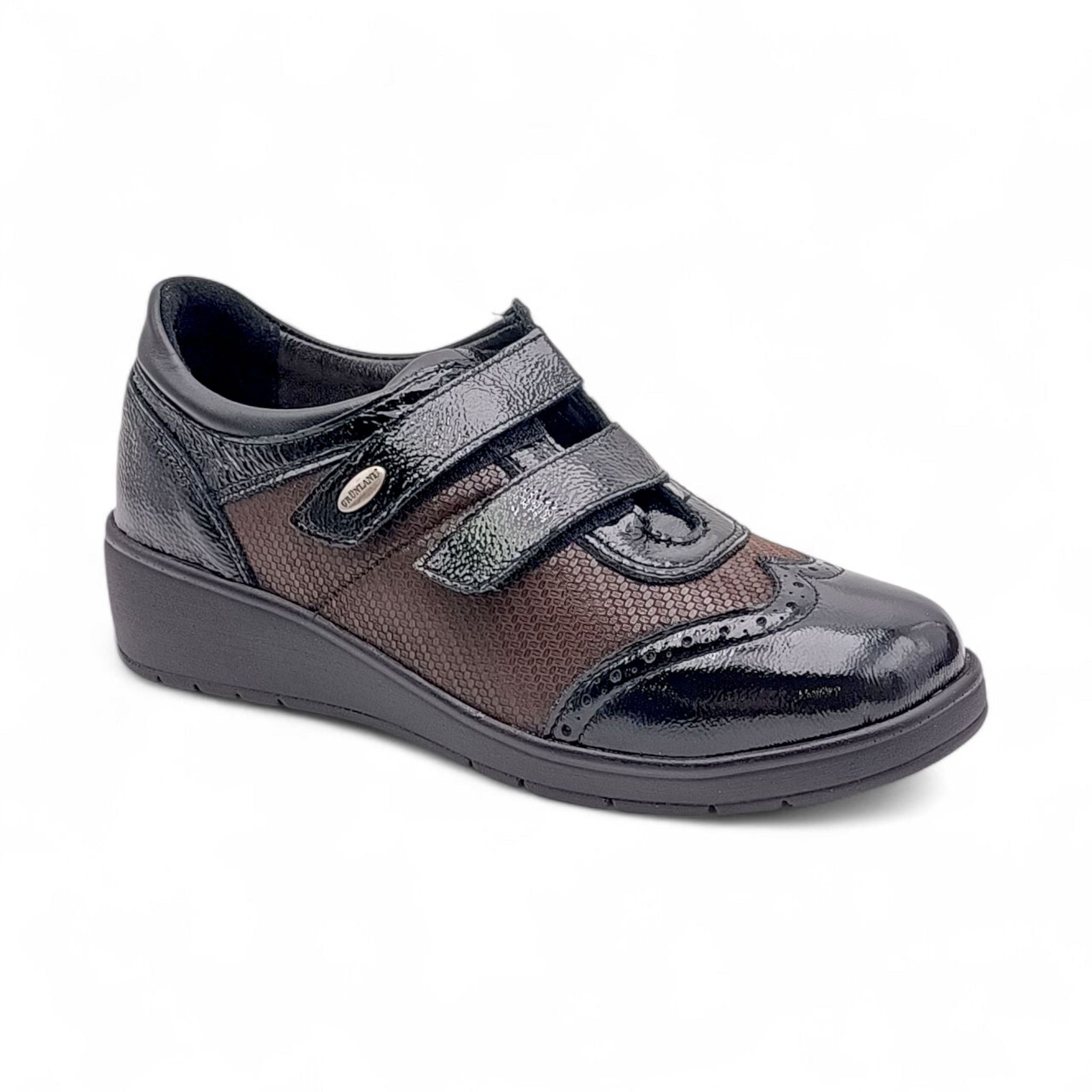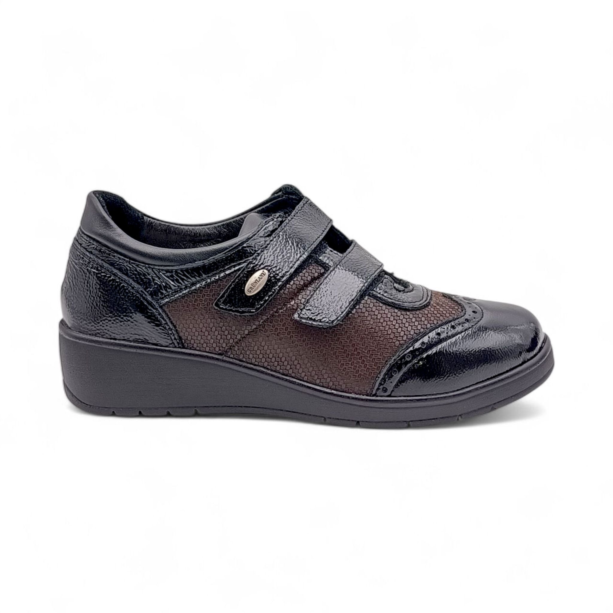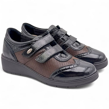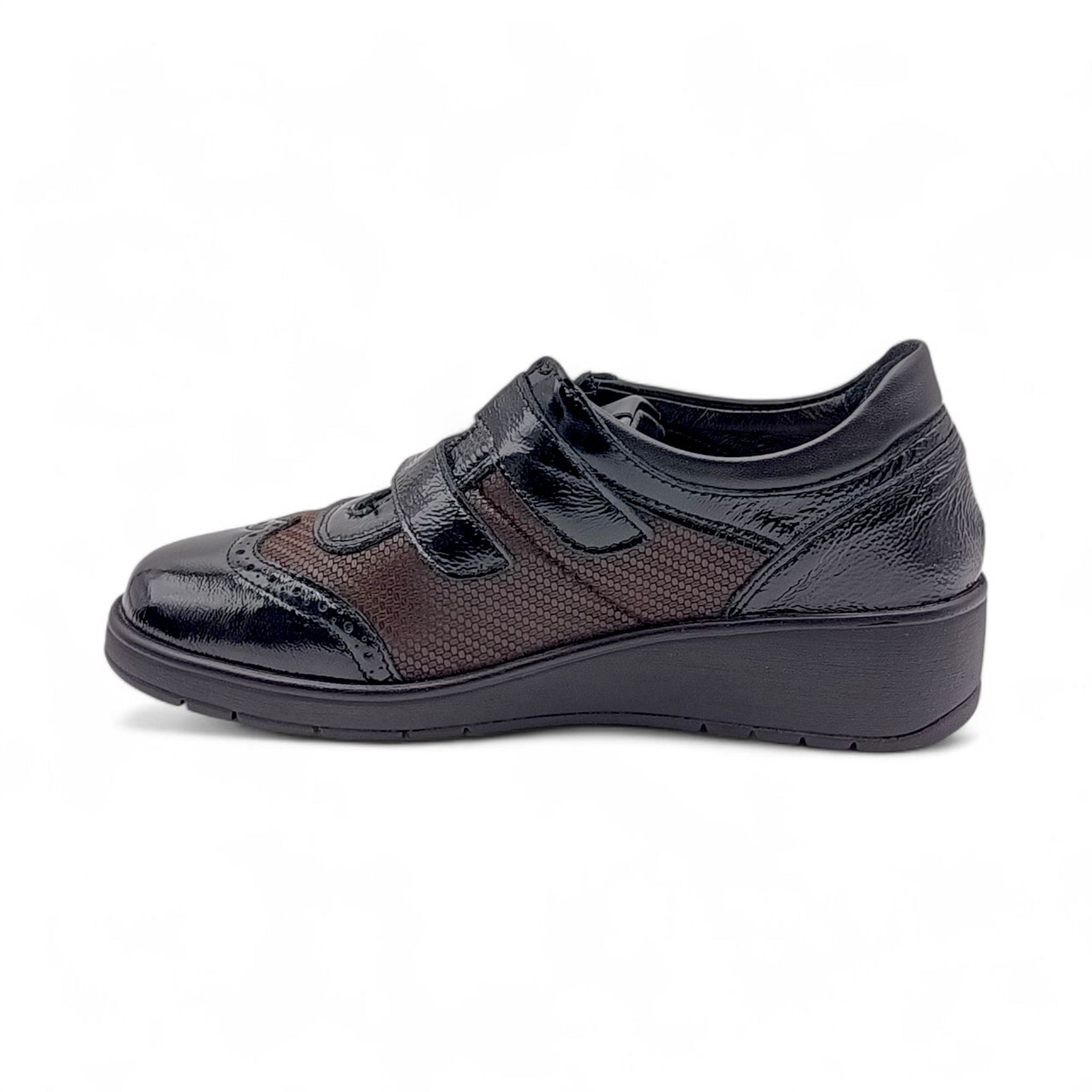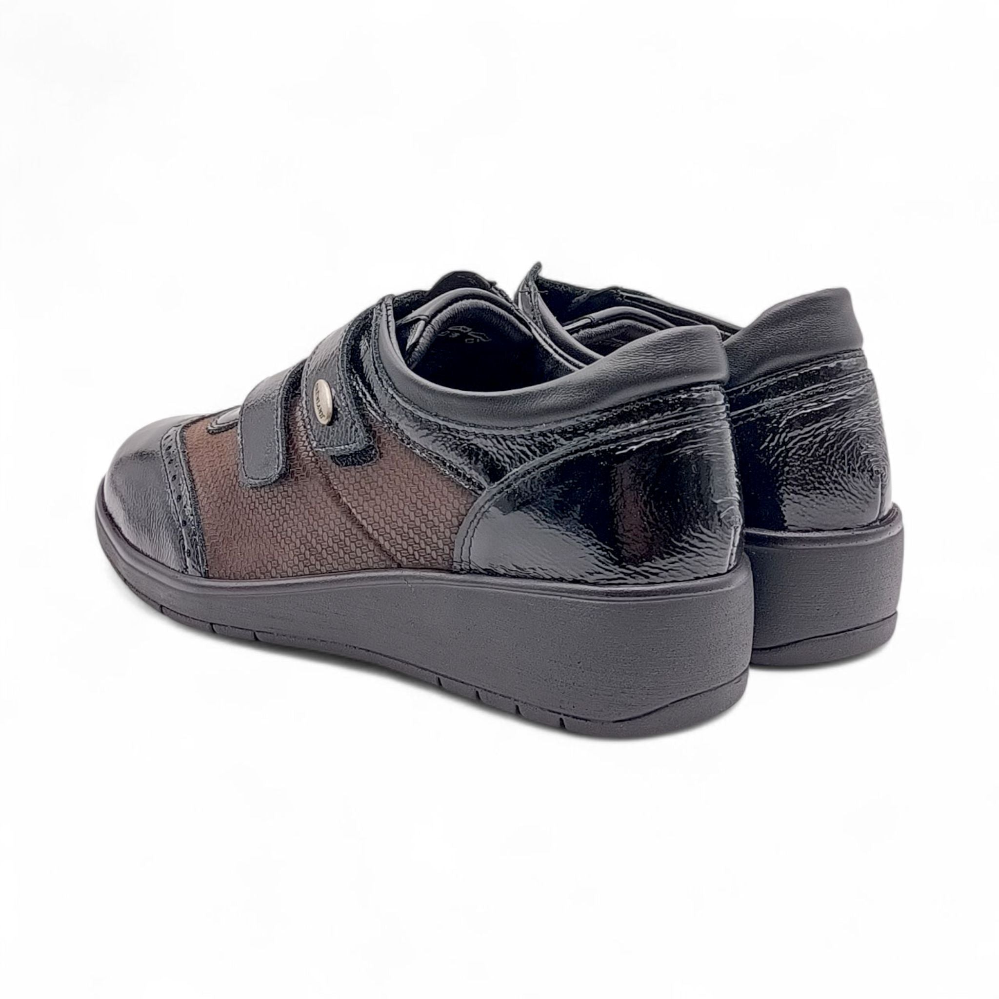 Sneaker comfort con plantare estraibile in materiale elasticizzato e pelle lucida nera.