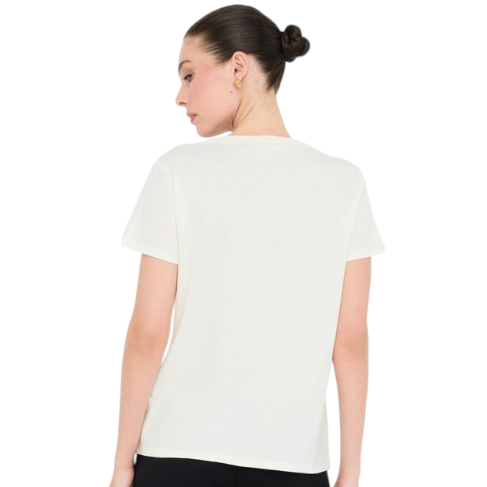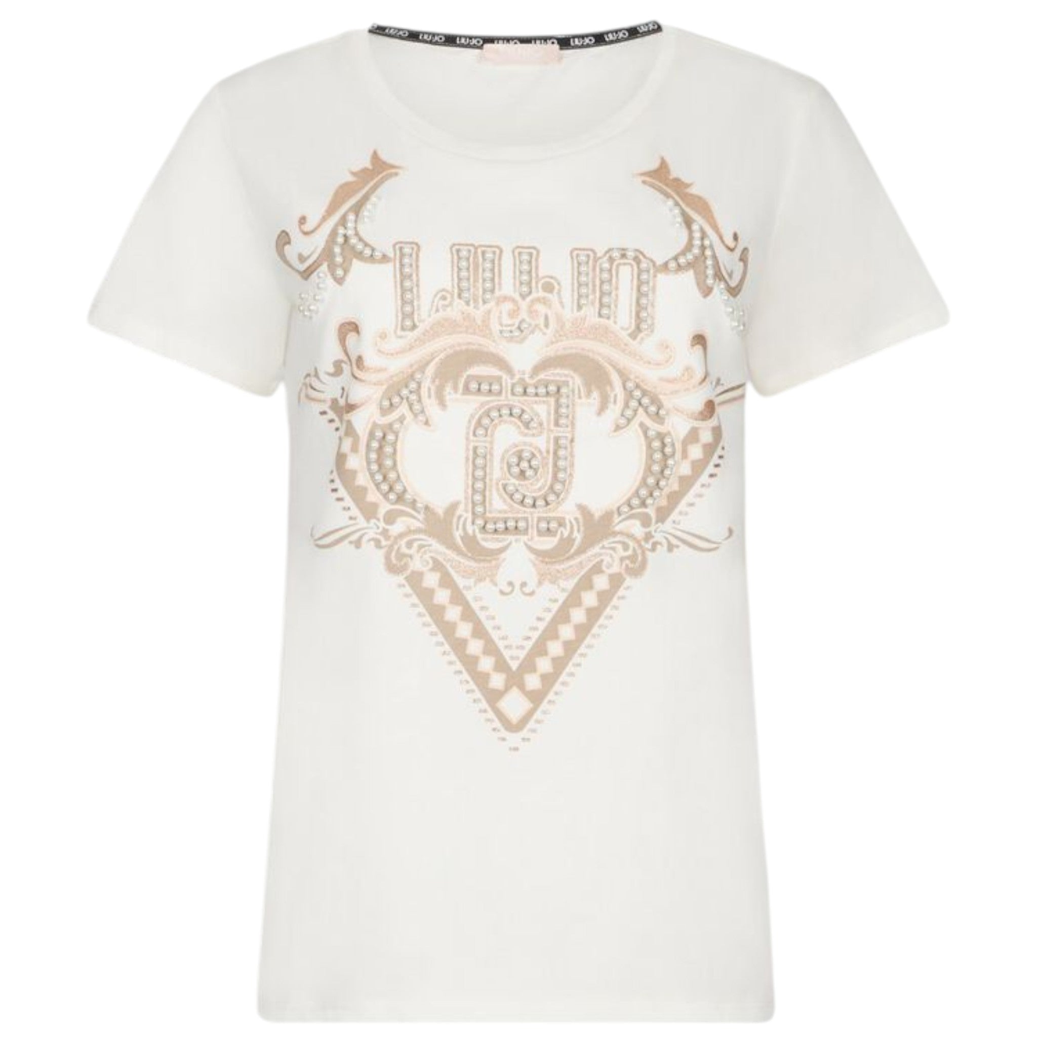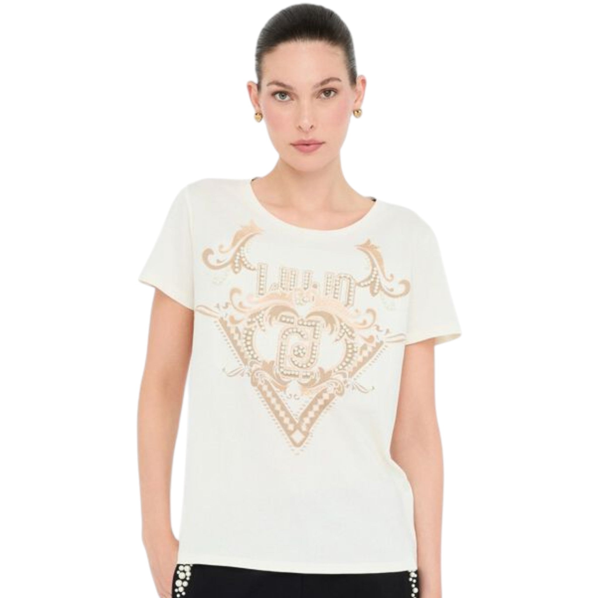 La stampa grafica con logo e delicati strass aggiunge un tocco brillante e distintivo, mentre il scollo rotondo e le maniche corte valorizzano una linea semplice e femminile.